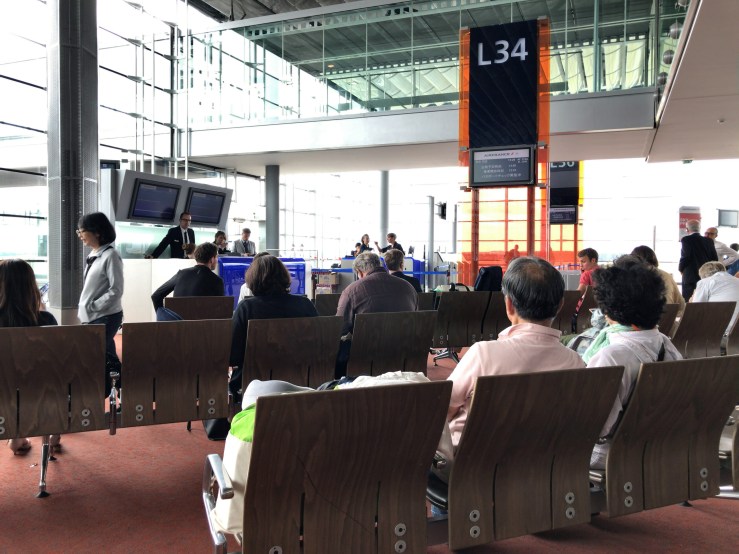 搭乗予定時刻の12時25分に合わせてゲートに行ったら出発予定時刻が1時20分から1時50分に伸びた…12時40分くらいにまた並ばされる。