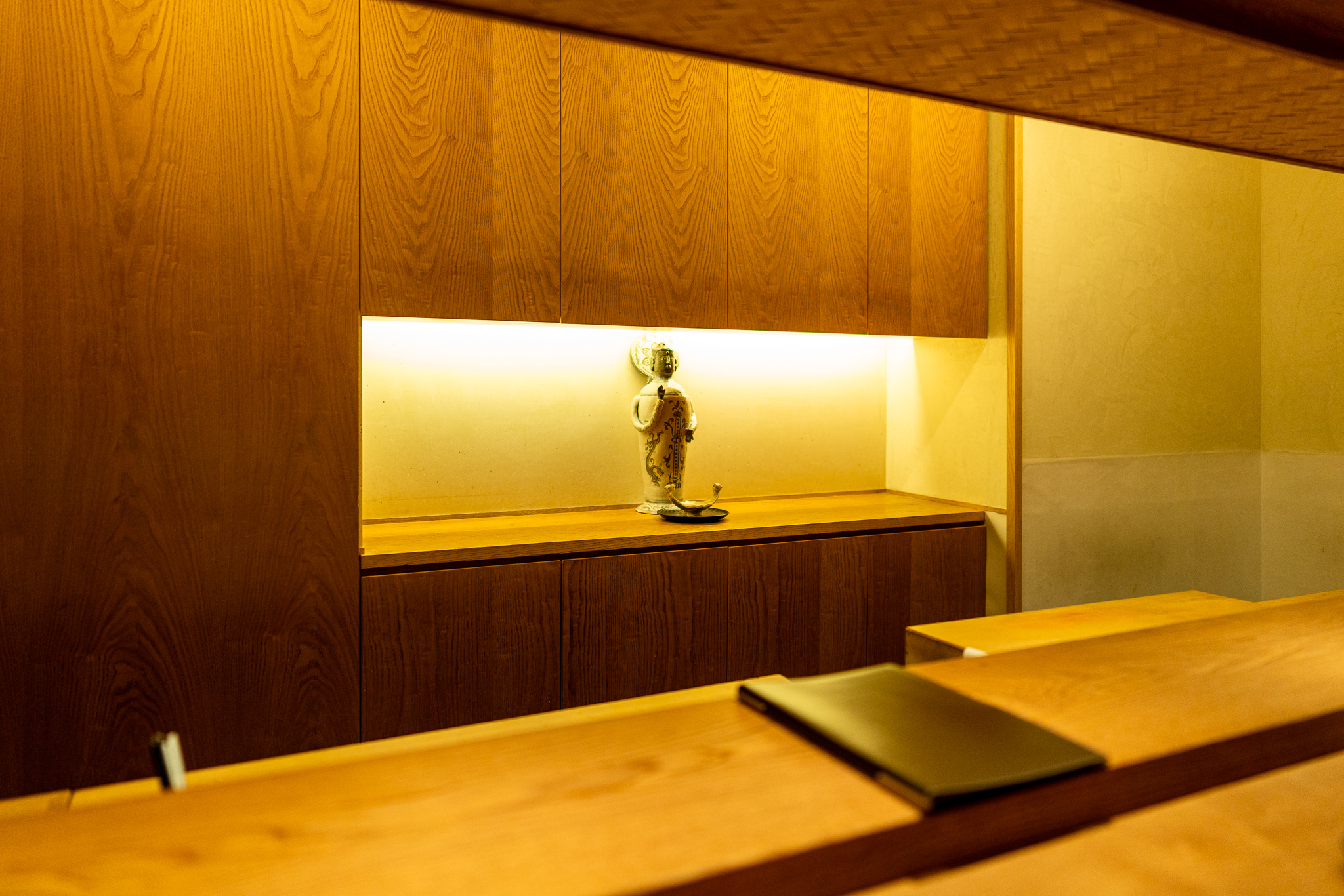 店内は高級感あふれる和モダンな世界。カウンターが6席、テーブルが4卓のどちらかというとテーブルがメインなのかな。カウンターでの調理もそれほど多くなく大将の小泉さんも厨房やテーブルをずっと回ってるのでそれほどカウンターに拘らなくてもよかったかもしれないが、それでもカウンターの席は特別な楽しさがあるね。