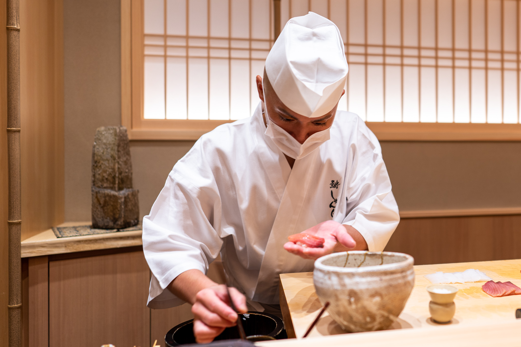 入り口は鮨さいとうさんと同じでお店の中で鮨 さいとうと鮨 しゅんじに別れてる。店内はカウンターのみで14席。キレイに木でまとめられた空間は高級鮨屋そのもの。