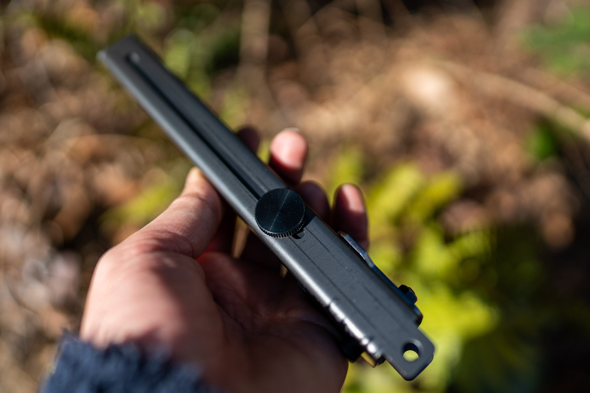黒皮鉄板(2.3mm)できていて約440gと手にするとその重さがズッシリくる。重さが耐久性などの信頼につながる感じがたまらない。これは収納時で長さが約215mm。