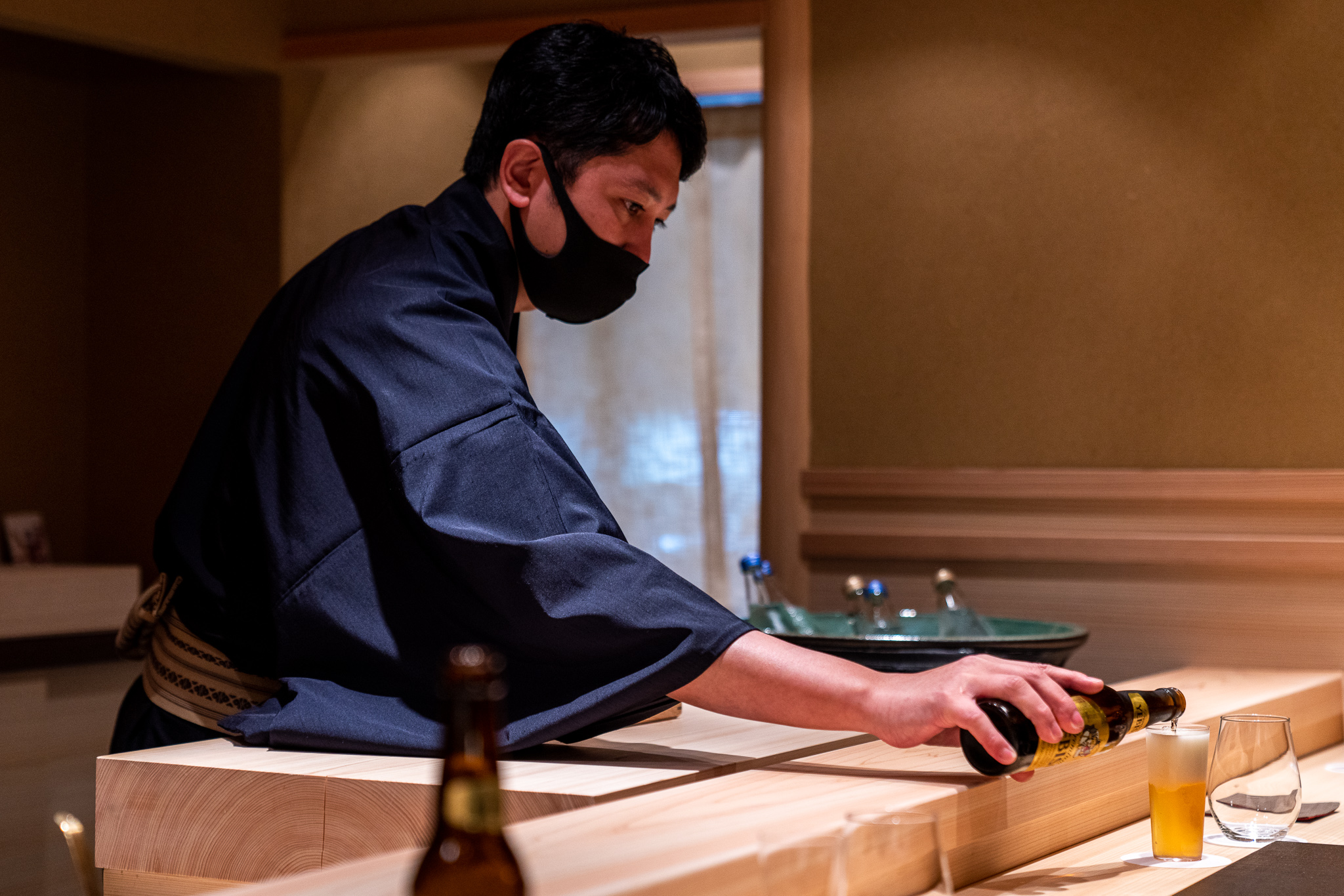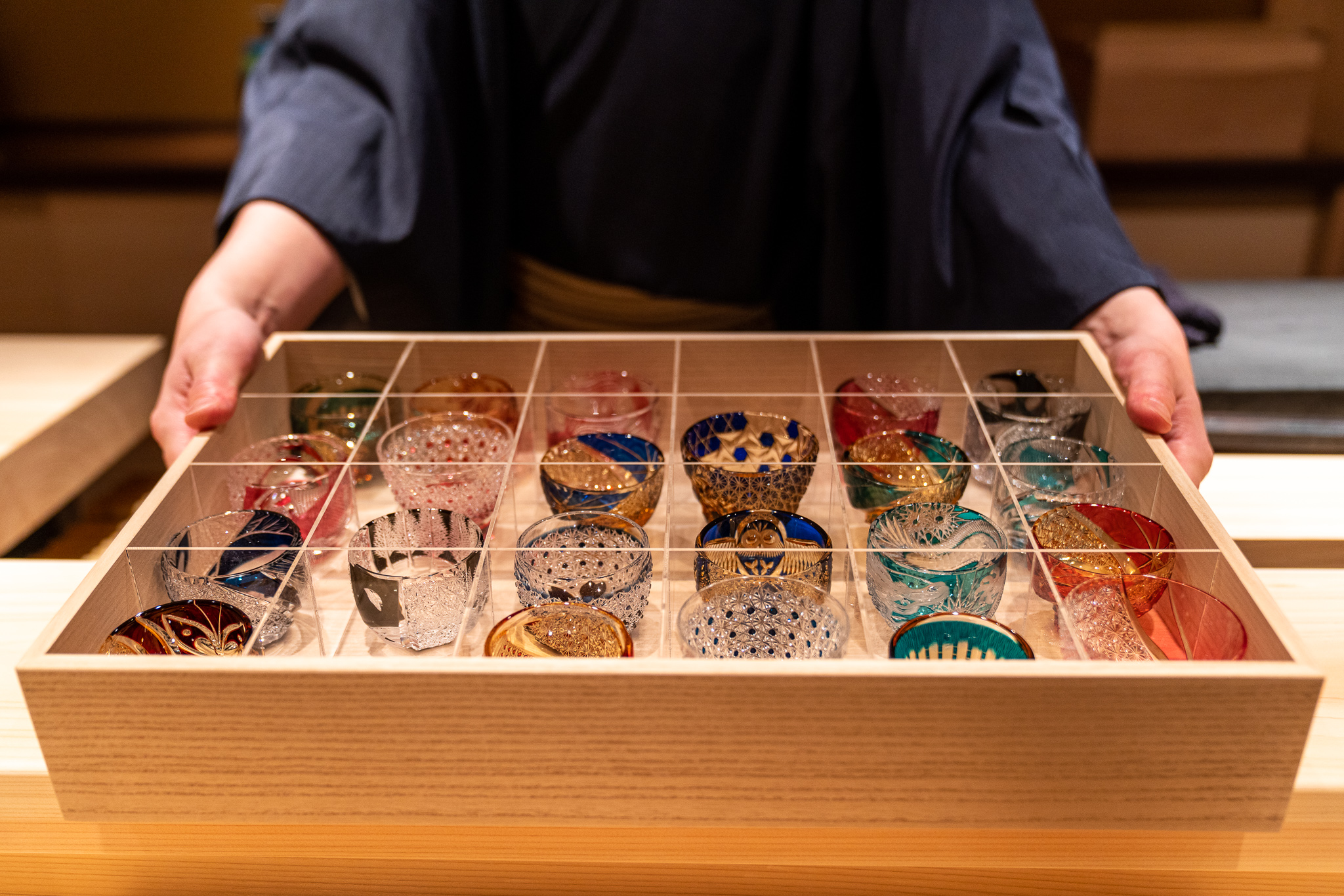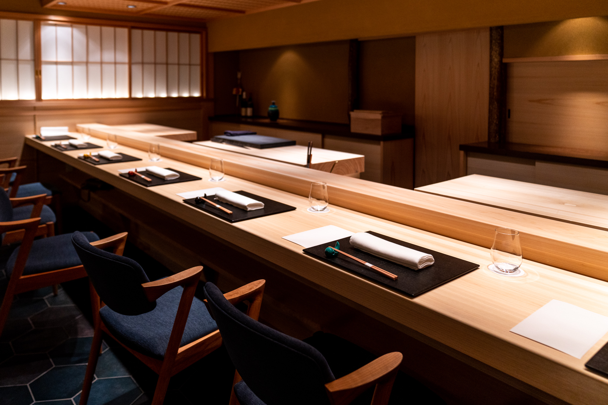 お店のガラスのファサードから店内に入って行く動線のアプローチが面白い。鮨 あおと同じデザイン会社の作品らしくやっぱり全体的なテイストが似ている。高級でオシャレな和モダンな店内は南青山に相応しい大人な空間だった。店内の至る所に坂本大将のこだわりが詰まってる。