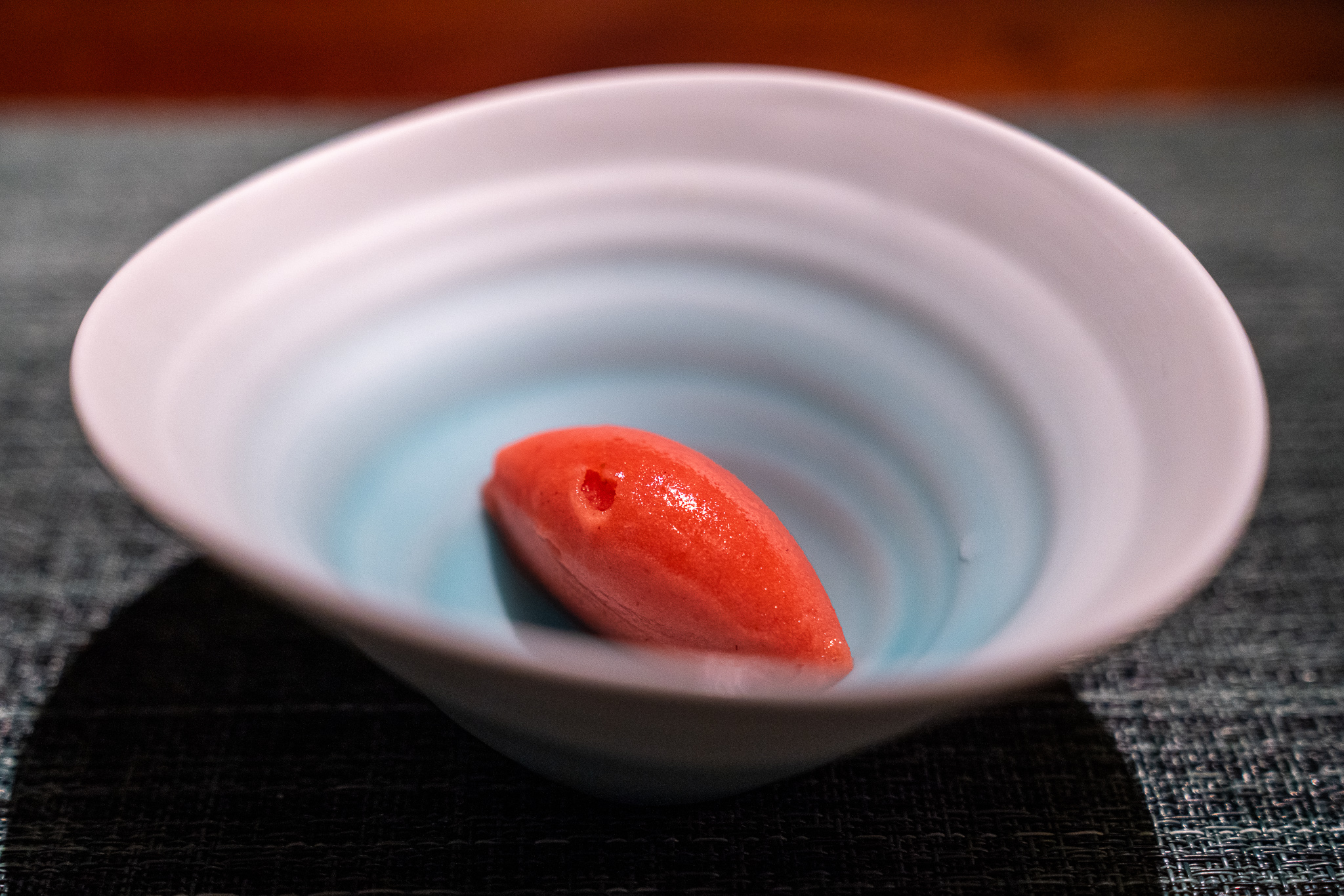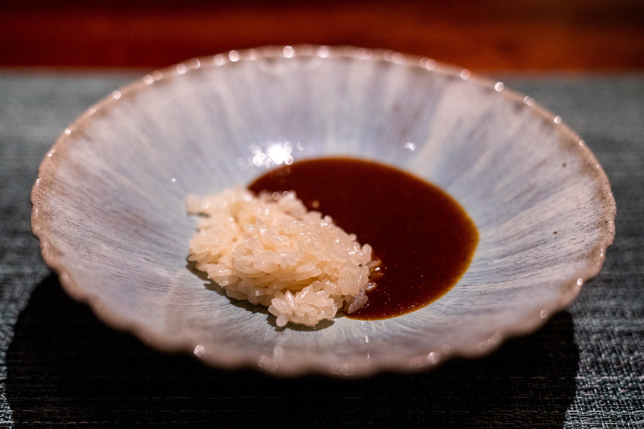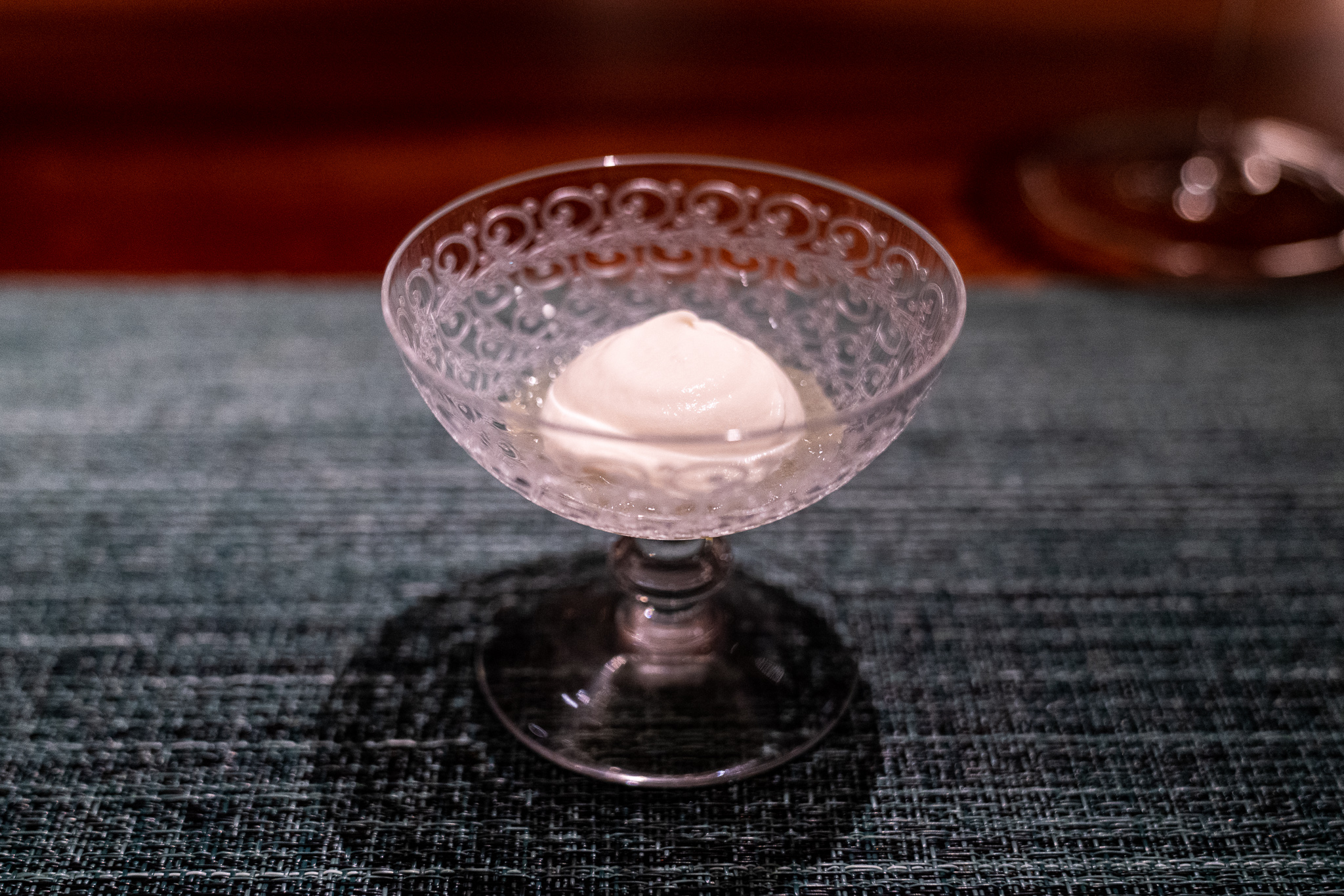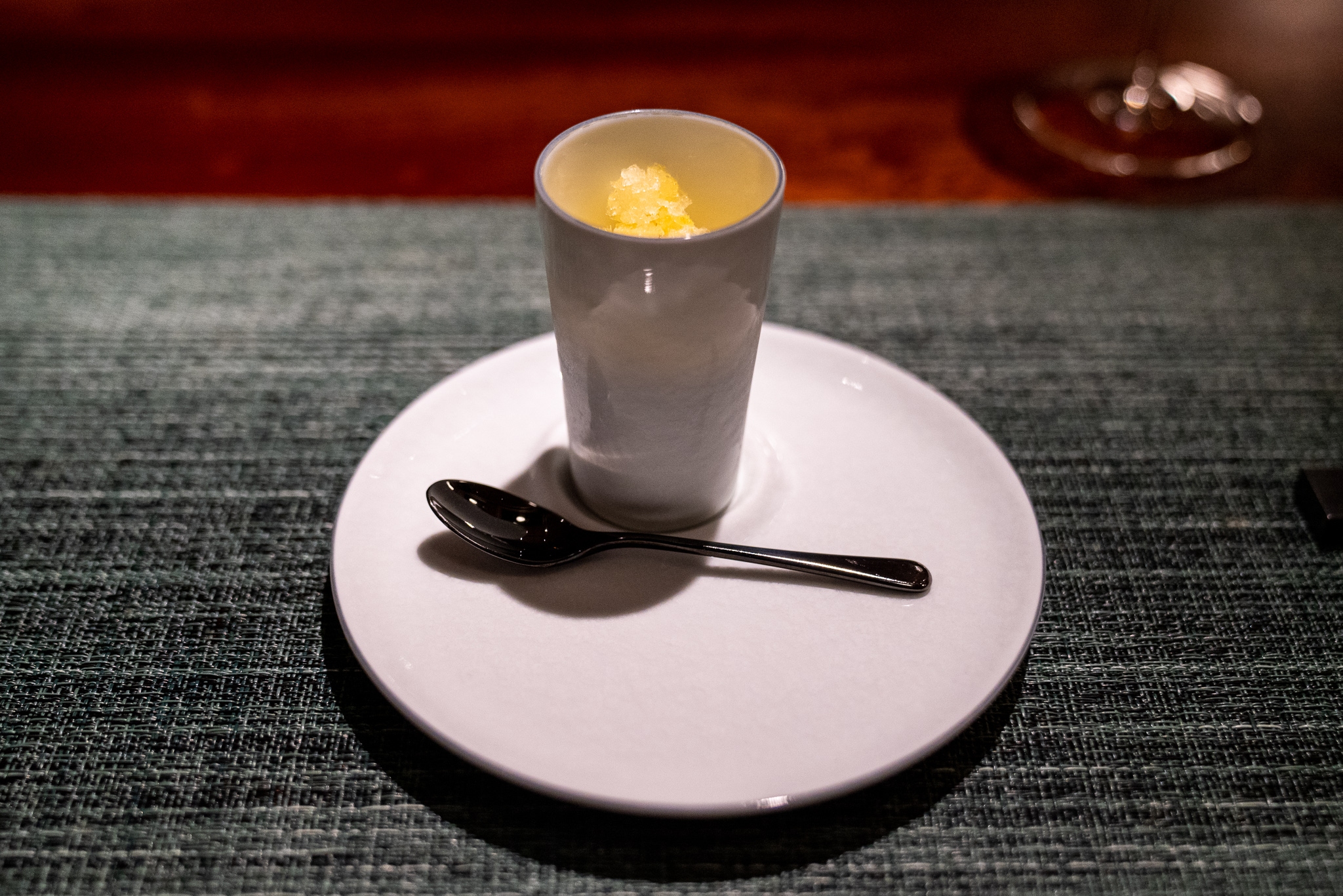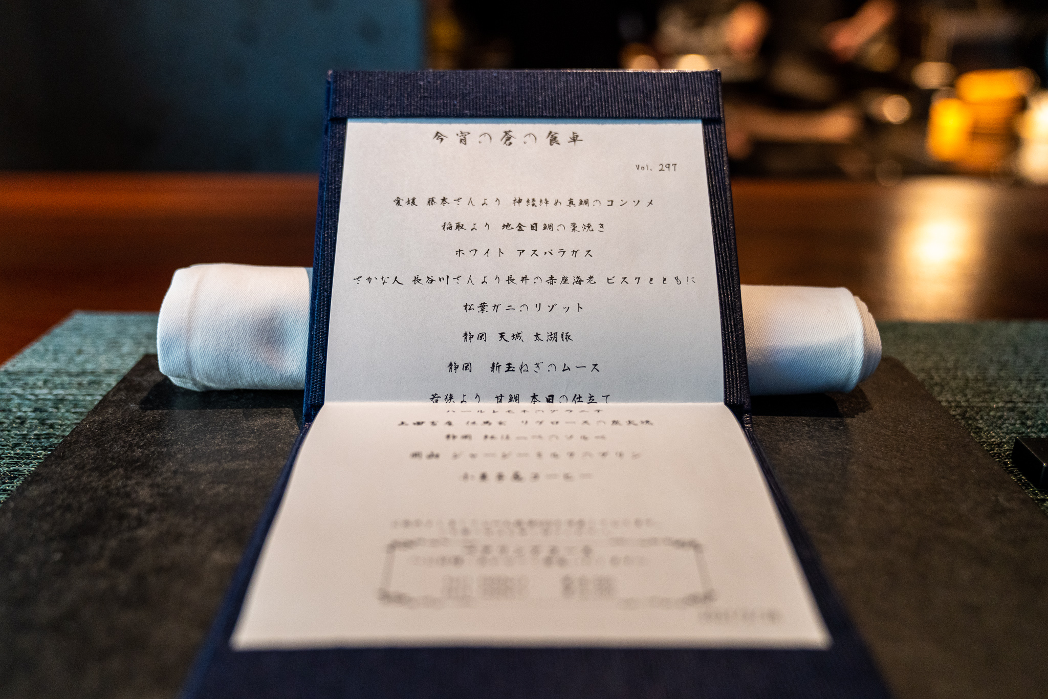 店内はカウンターのみで6〜8席で運用してるよう。峯村シェフ、厨房スタッフ2人、ソムリエ2人(!)の総5人が狭い厨房とカウンターを行き来しながら有機的に連携しながらコースが進められるけどそのプロらしい余計なものが全くない動きにも感心しちゃう。