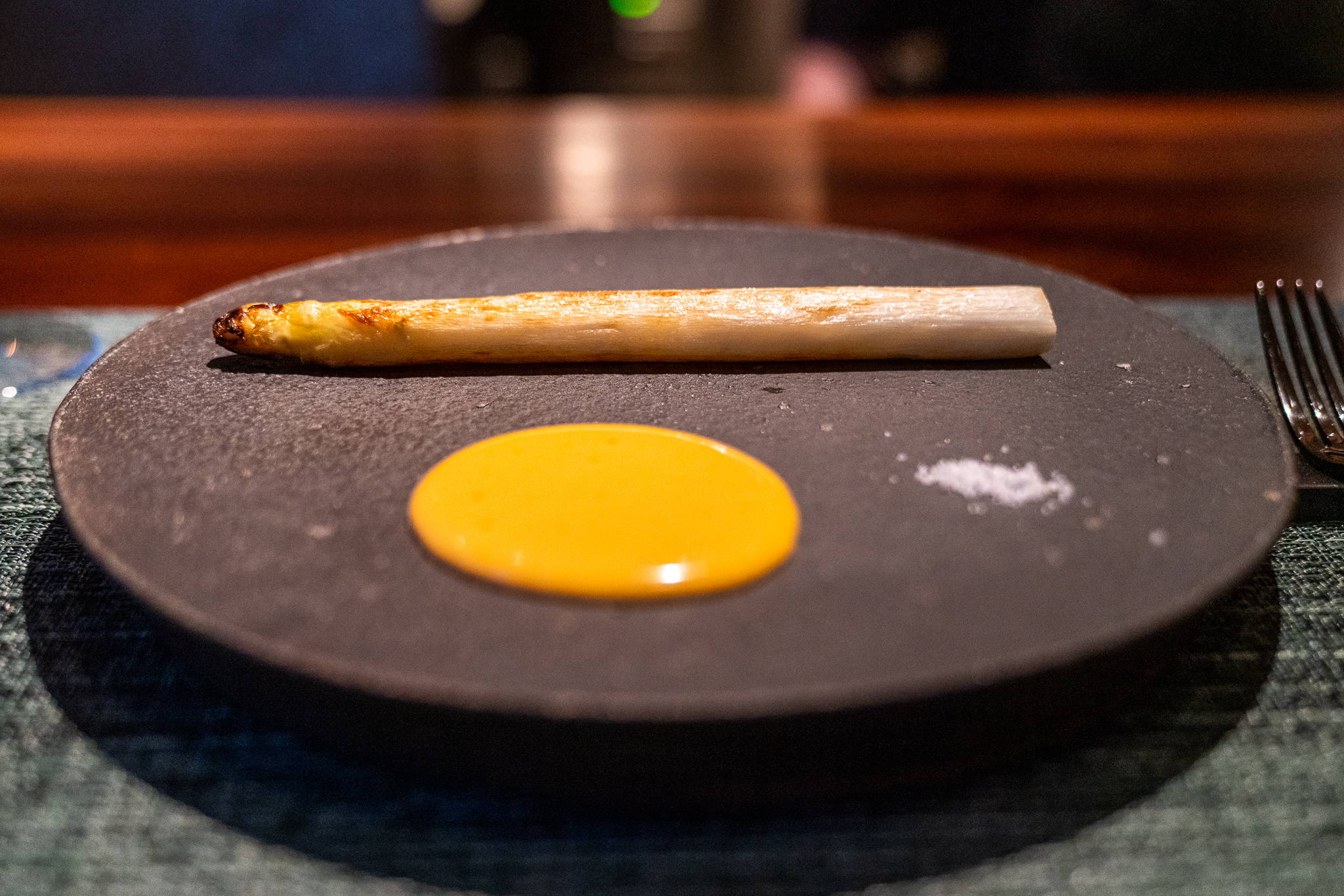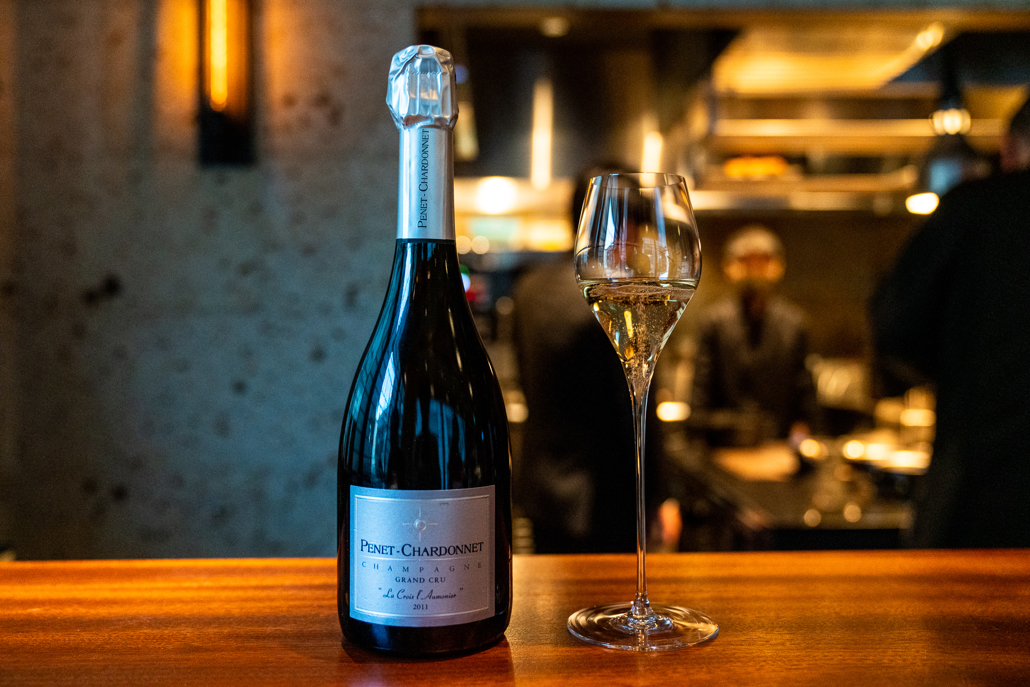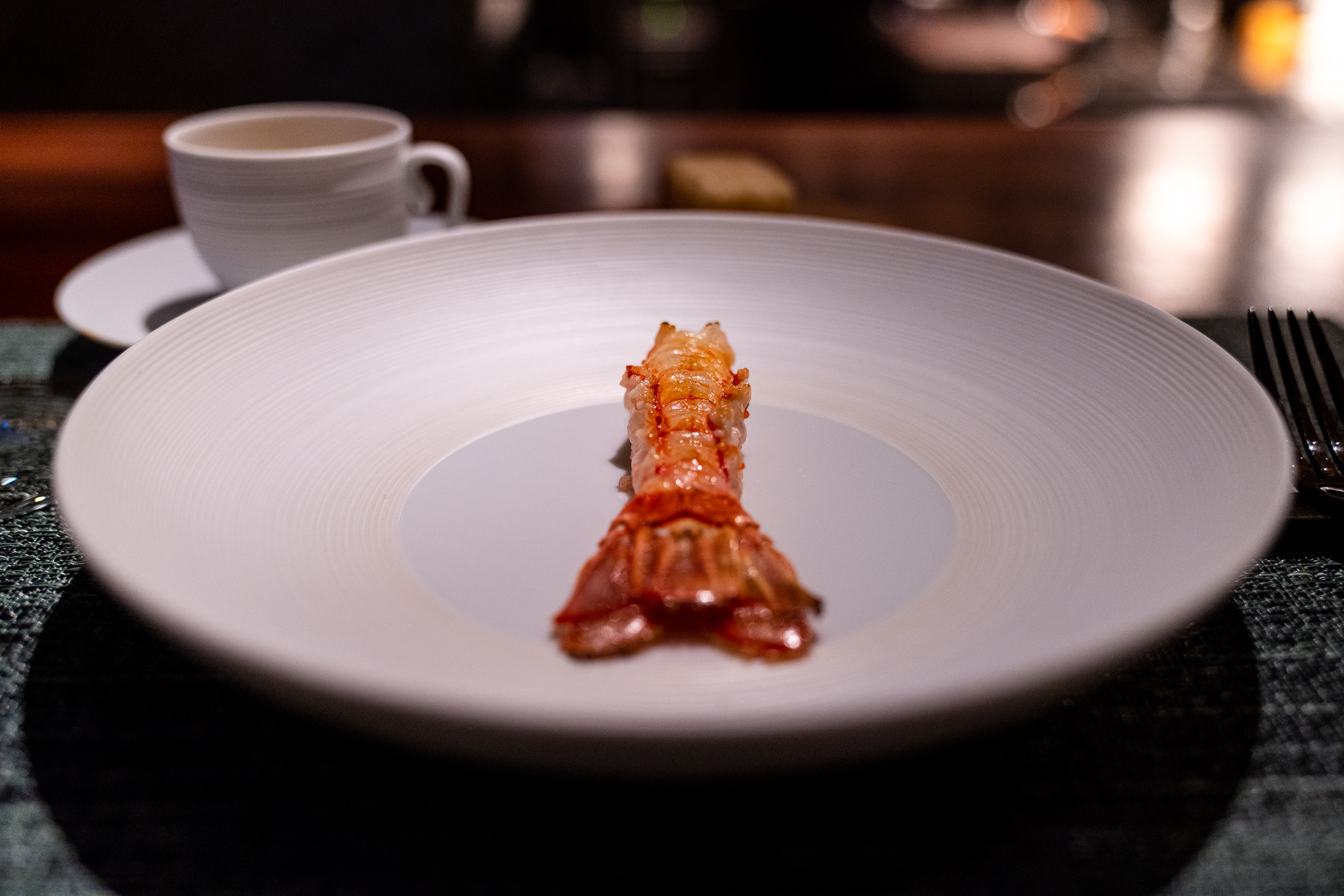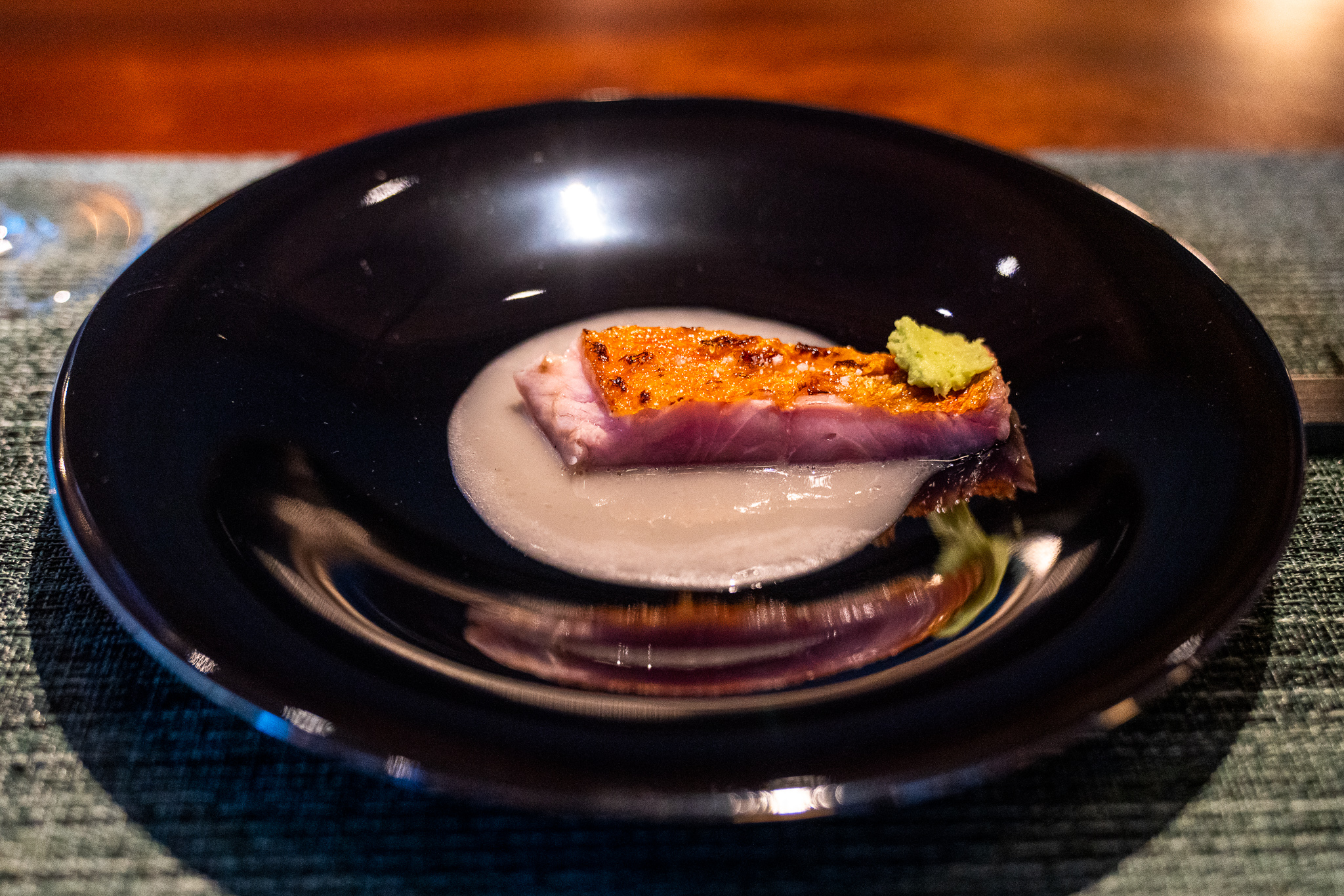 店内はカウンターのみで6〜8席で運用してるよう。峯村シェフ、厨房スタッフ2人、ソムリエ2人(!)の総5人が狭い厨房とカウンターを行き来しながら有機的に連携しながらコースが進められるけどそのプロらしい余計なものが全くない動きにも感心しちゃう。