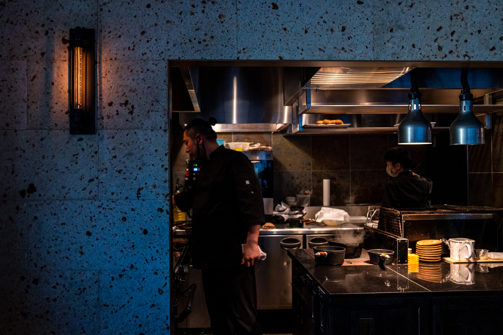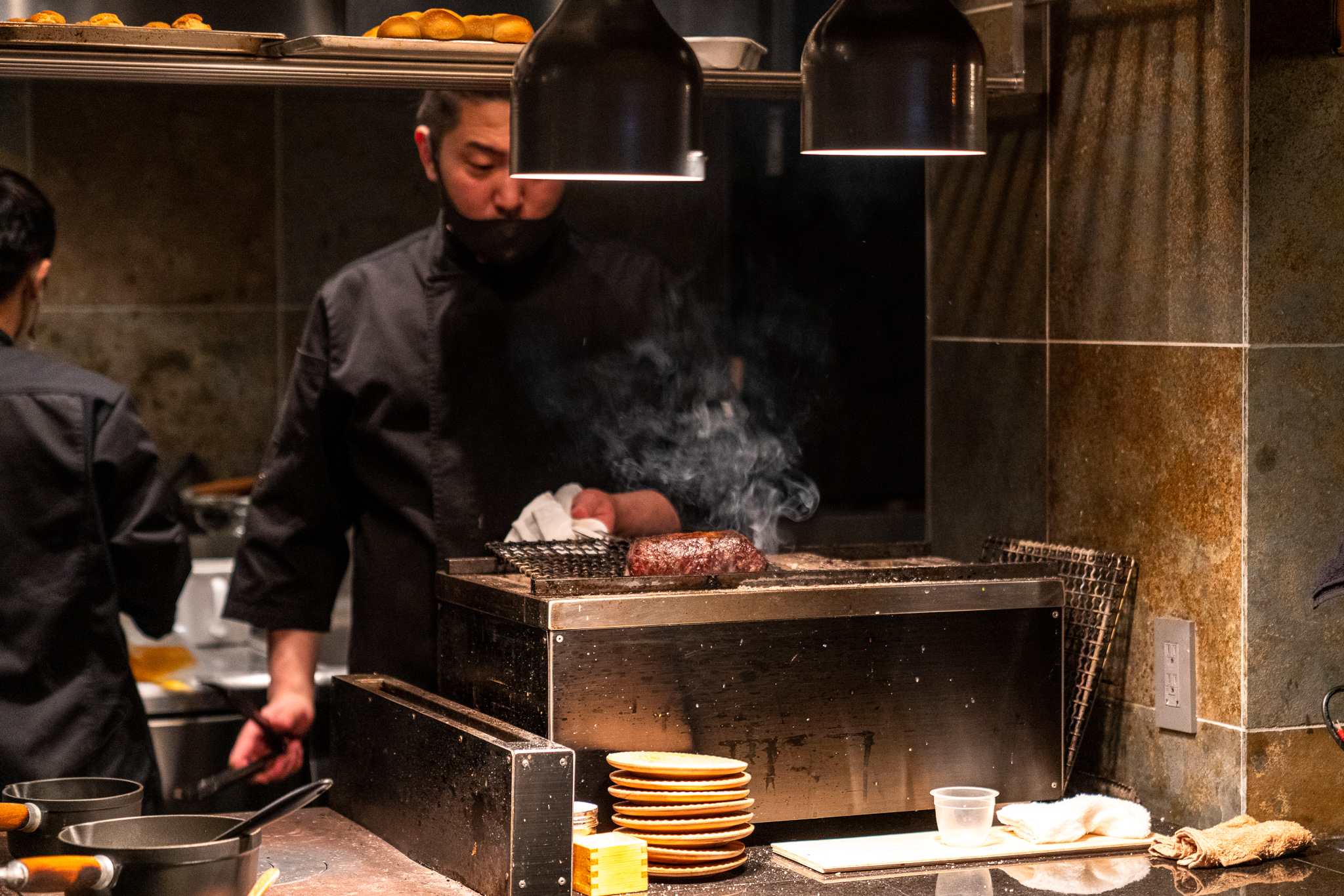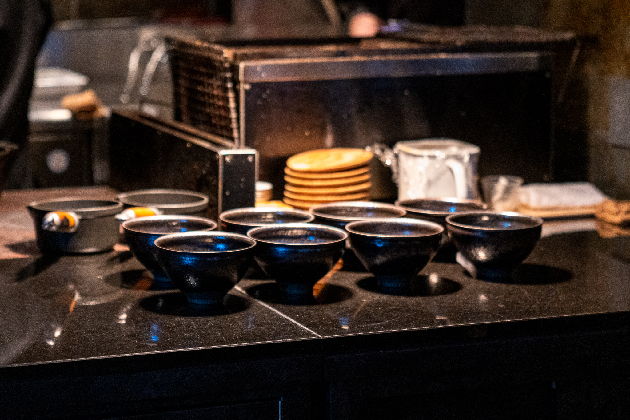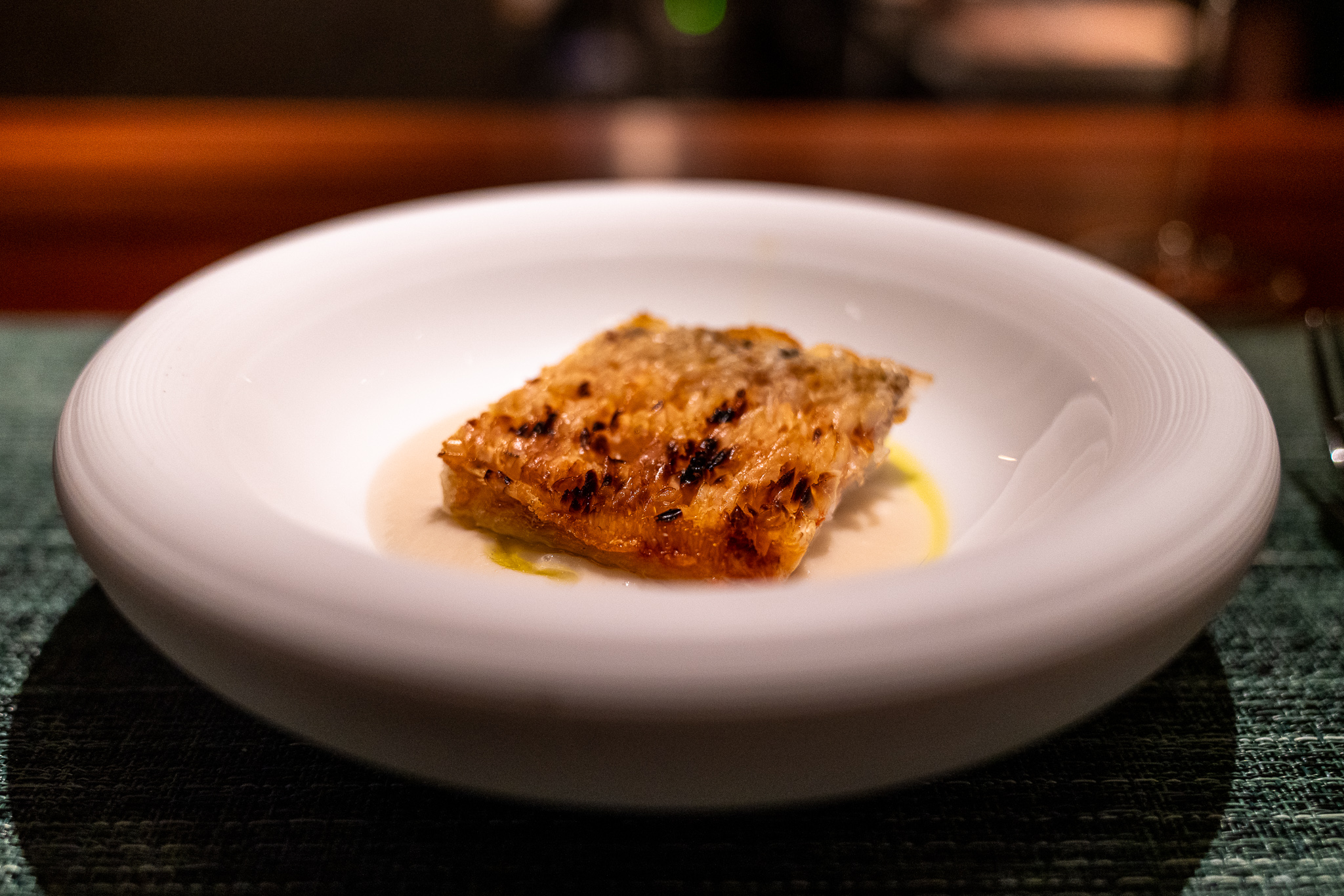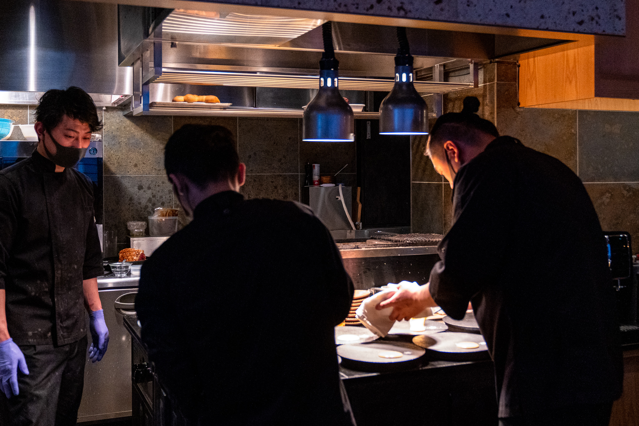 店内はカウンターのみで6〜8席で運用してるよう。峯村シェフ、厨房スタッフ2人、ソムリエ2人(!)の総5人が狭い厨房とカウンターを行き来しながら有機的に連携しながらコースが進められるけどそのプロらしい余計なものが全くない動きにも感心しちゃう。