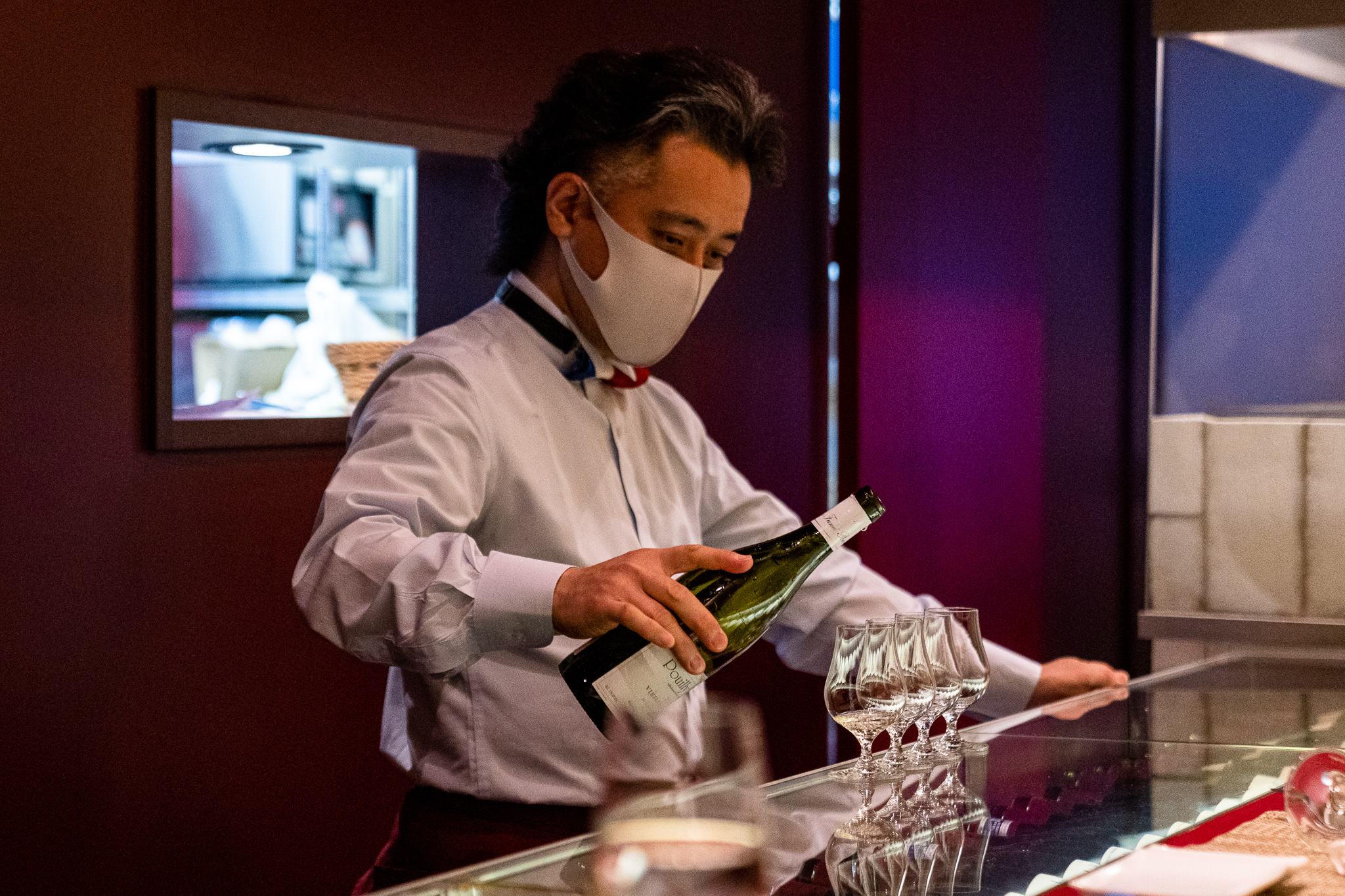 Charbon-pi しゃるぼんぴは炭とマリアージュという意味らしい。オーナーソムリエの進藤さんはブルゴーニュの有名ドメーヌのジョルジュ・ルーミエで2年間修業したこともあるワインのスーパーエキスパートな方。湯澤シェフの本格的フレンチに合わせたワインのペアリングは極上そのもの。ブルゴーニュワインだけではなくてその幅を広げてシャンパーニュから白へ、また赤へつなげていくその全体の流れが非常にバランスがよくワインの味をしっかり楽しめる構成になっていた。