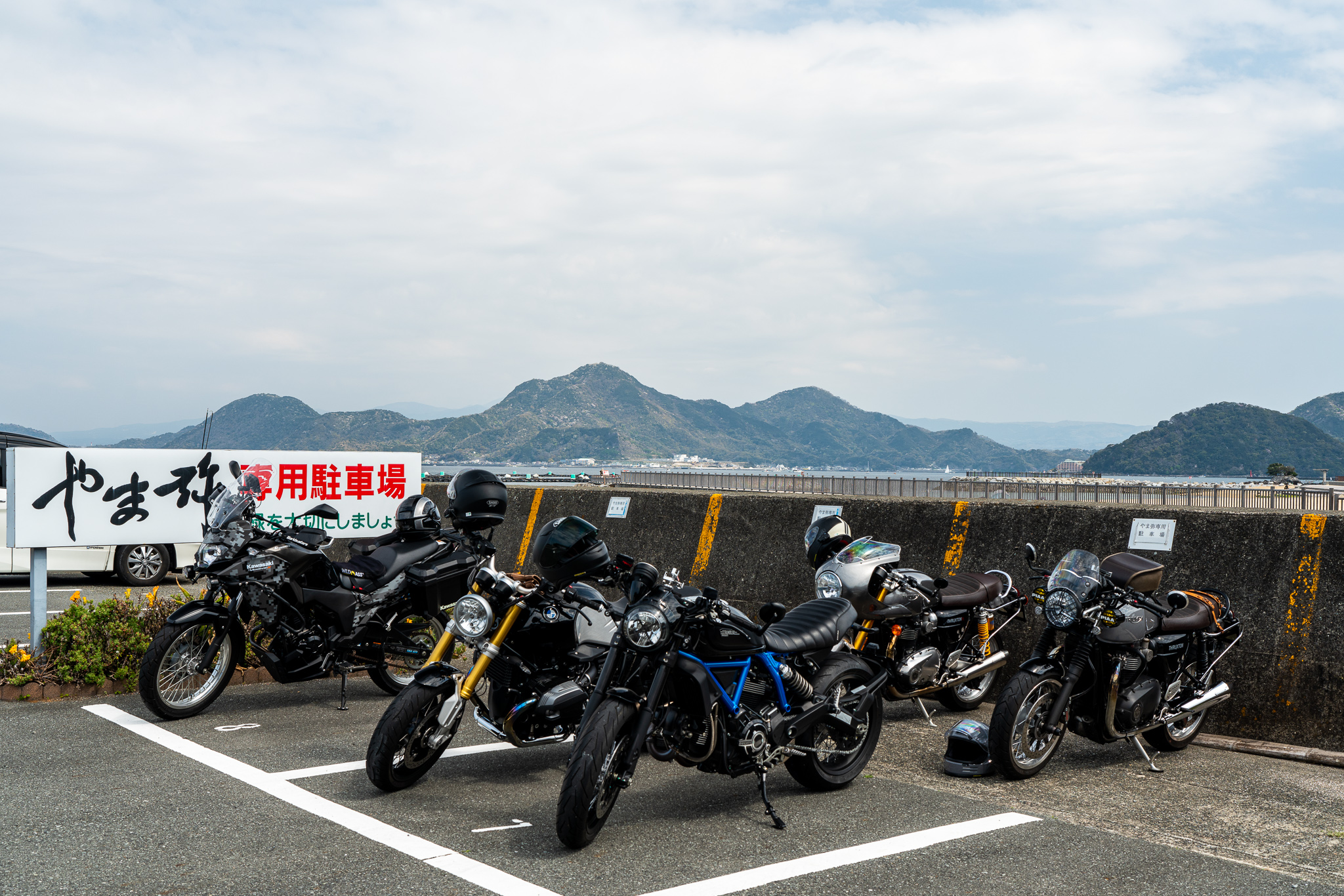 最初の目的地は西伊豆の人気定食屋「やま弥」。11時半営業開始のところ、11時前に着いたのにもうすでに何組か先客がいた。バイクを停めてヘルメットやグローブなどを片付けてたらお店の中からスタッフさんが出てくるのではないか!ナツさんが一番動作が早くて片付けが終わってたので申し訳ないけど走ってもらった。感謝×2。