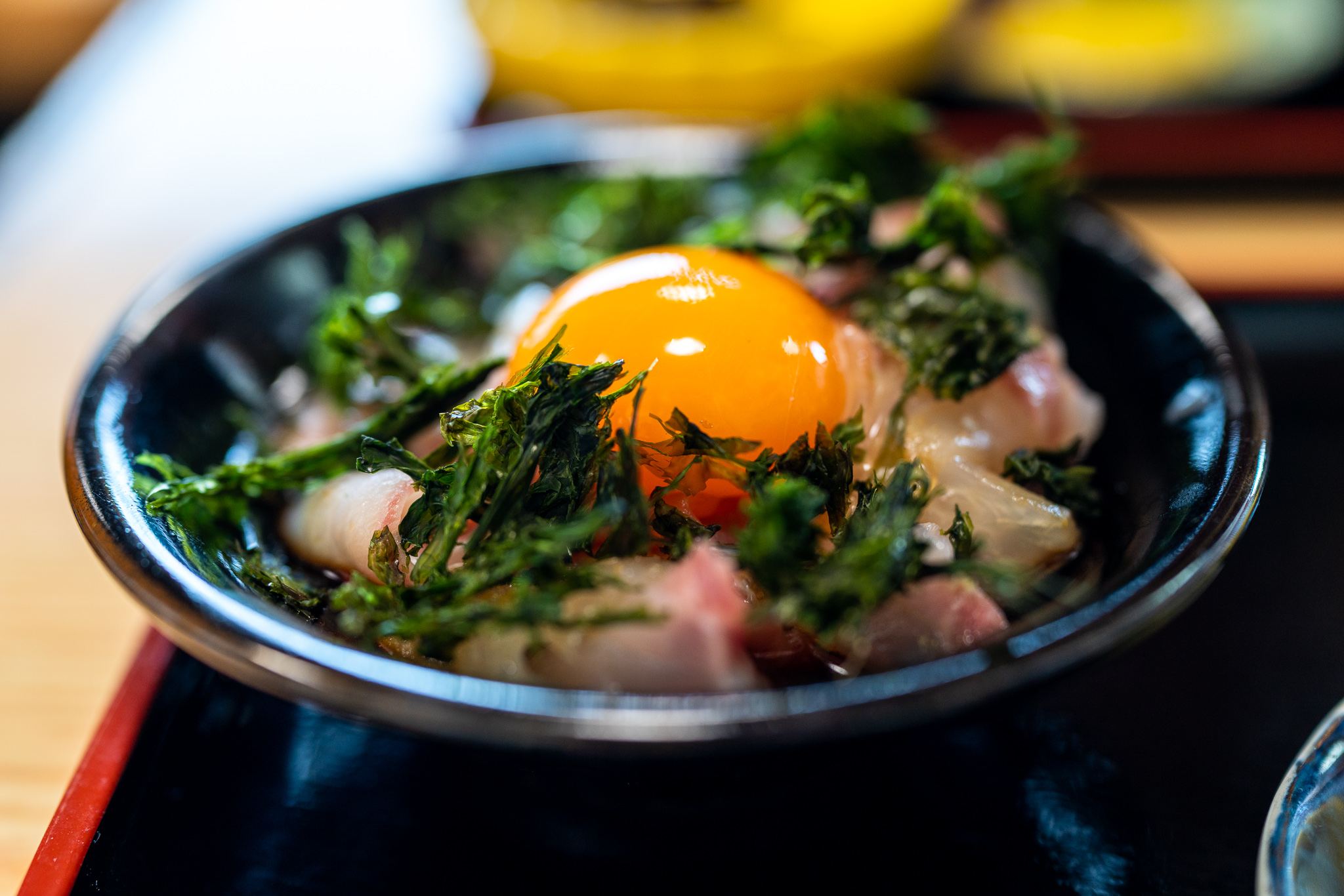 お!これが噂の鯛丼!珍しく鯛とご飯が別々に出されてた。まず鯛と黄卵、海苔をよく混ぜてから