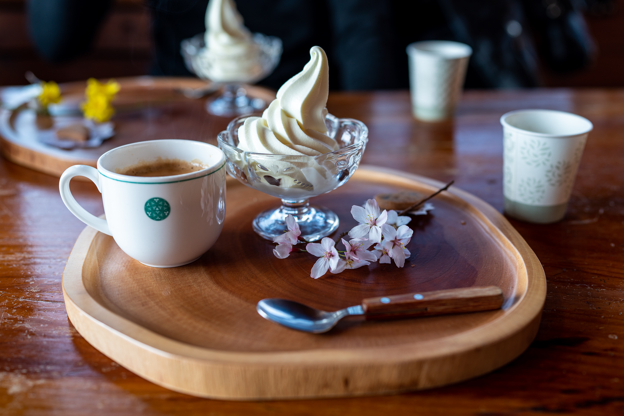 コーヒーとソフトクリームを頼んだらプレートをキレイな桜で飾ってくれてテンションが上がる。疲れた体に甘いものは効くね。元気が出る!