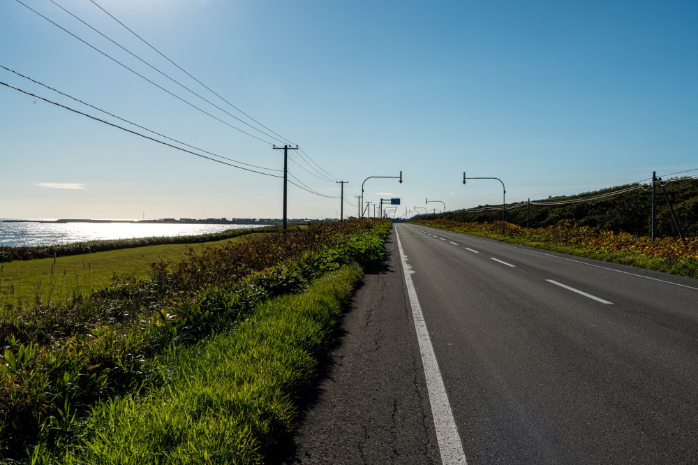 出発して1時間くらい走ってるけど途中出会ったのは軽トラックと大きいトラックが3台くらい。たぶん日本で一番一人に慣れる道ではないかと思う。とにかく天気にも恵まれて青い空と穏やかな海と風と一緒に秋の色に染まってるオホーツク街道を走るのは爽快で気分がいい。
