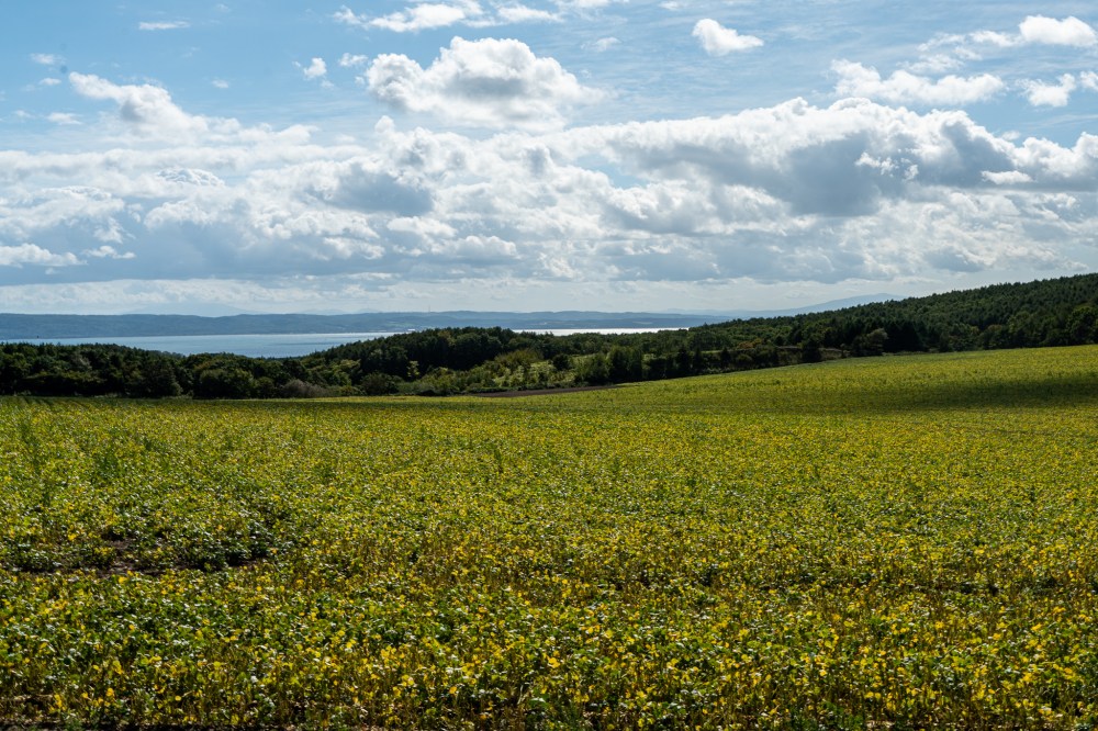 サロマ湖を過ぎて常呂町に入るとグーグル先生が急に右折しろと指示を出す。どう見ても直進が合ってると思うけど…ここはグーグル先生を信じて右折してみる。道がどんどん細くなってきて不安になってきたところで急に前が開けてそこにはキレイな畑が広がっていた。なんの畑かは知らないけど畑と森、海と空のコントラストが美しい。きっとグーグル先生はこれを見せたかっただろう。