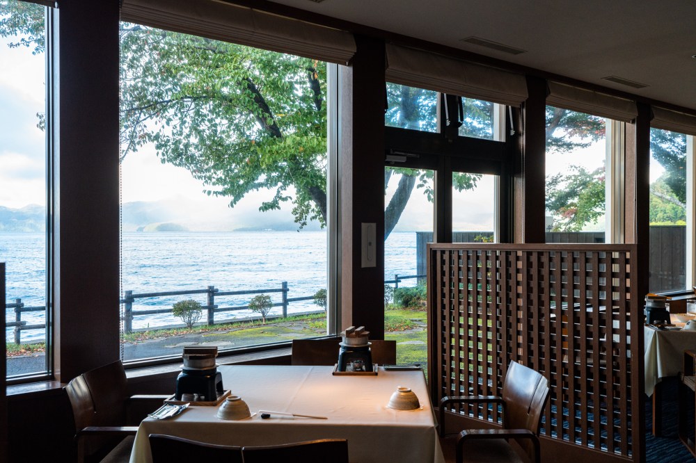 いよいよ朝ごはんの時間。昨夜は暗くてあまり見えなかったが、レストランからの湖の眺めも素敵だった。ディナーも夏だったら支笏湖の夕暮れの絶景を堪能しながら食事ができるかもしれない。