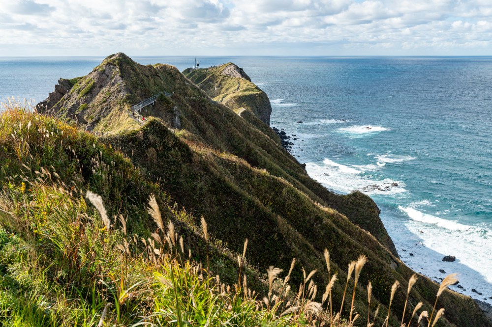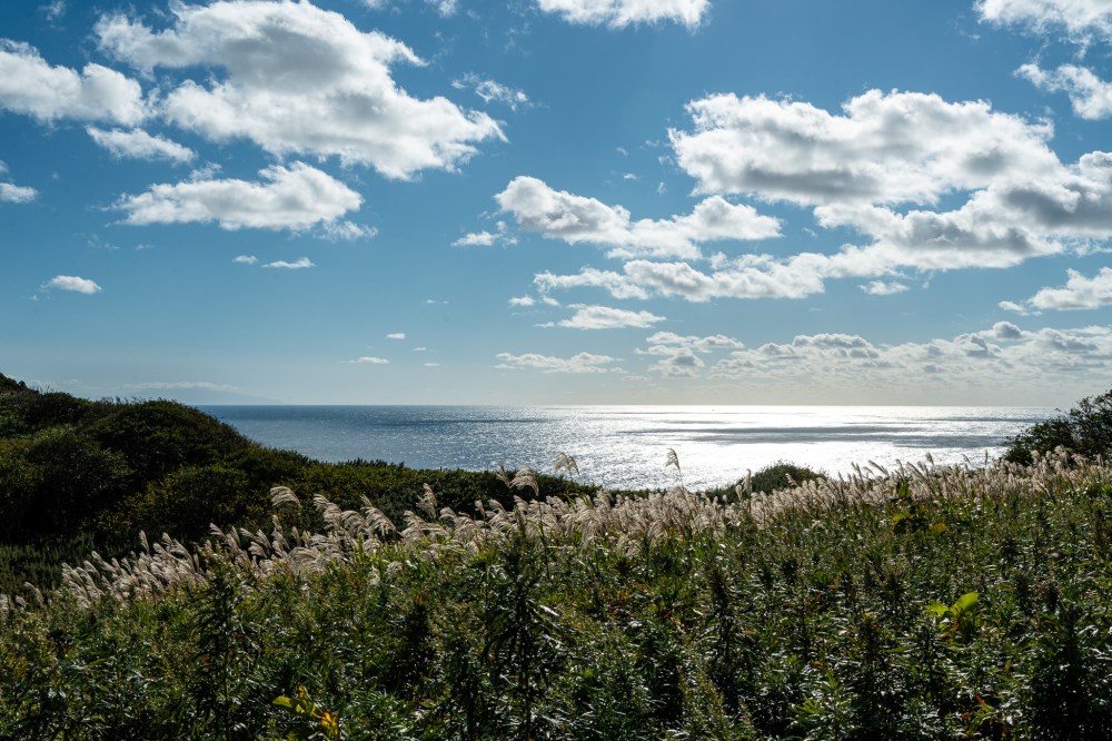 いよいよ神威岬!坂を登って行くとススキが広がっていた。しかし、雲が多くなって風も結構強い。これはもしかすると…