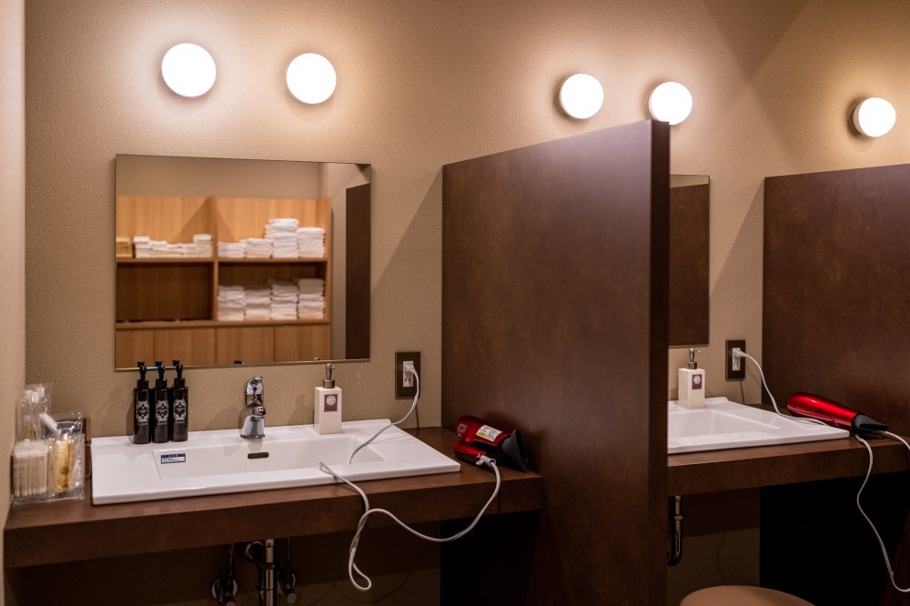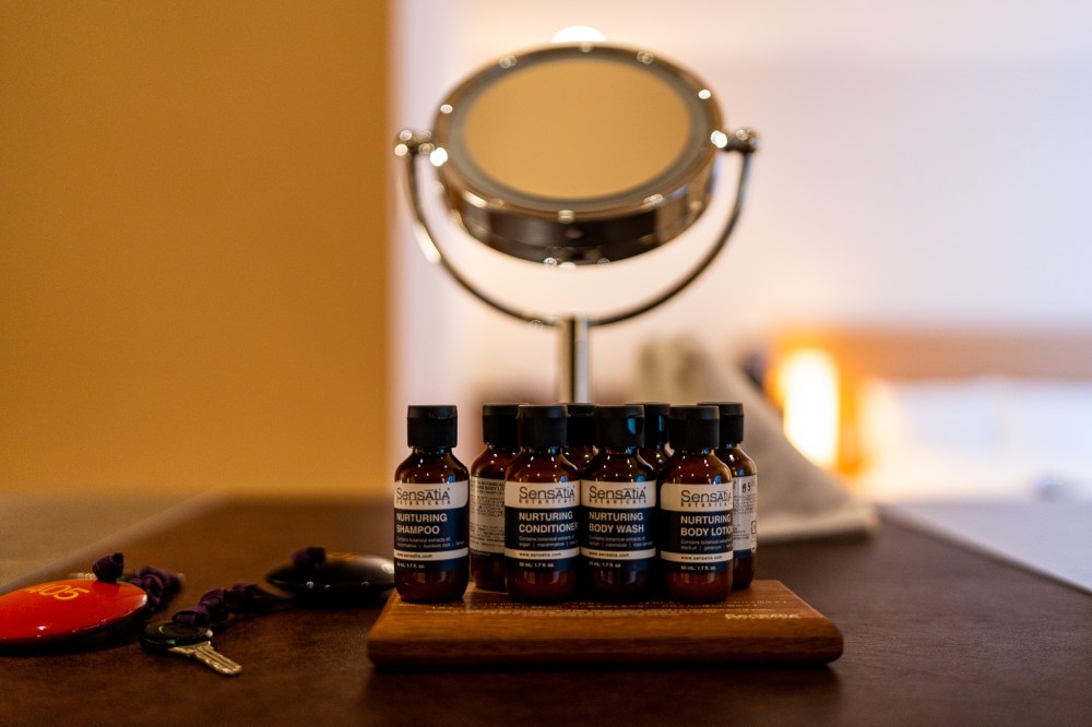 洗面台の上にはアメニティが人数分たっぷりおいてある。この旅館オリジナルのものらしいが、香りもよくて上品な感じがする。