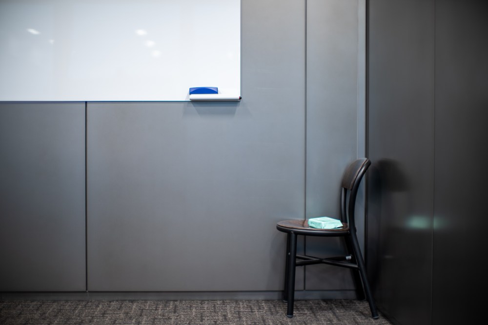 壁紙や椅子、本、ベルトのそれぞれの色味や質感、窓から滲む光も上質な感じ。