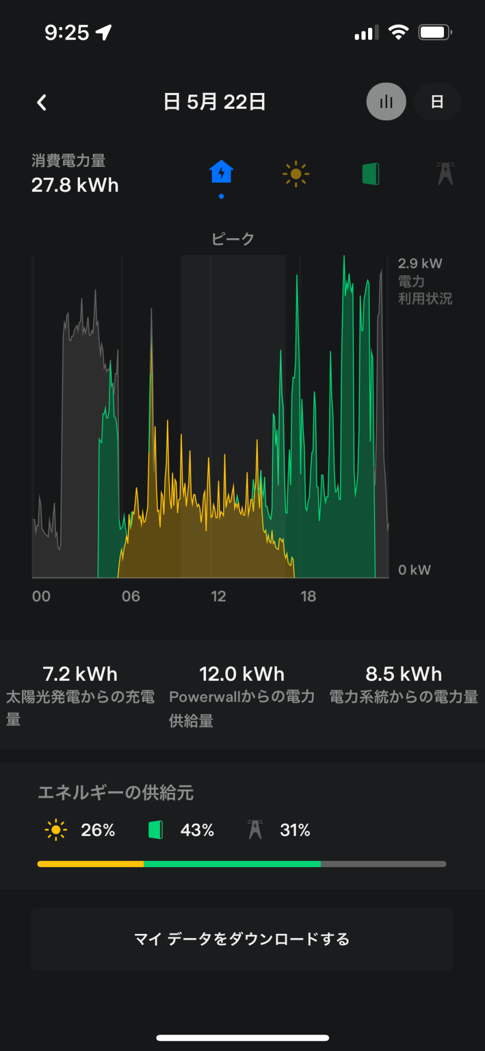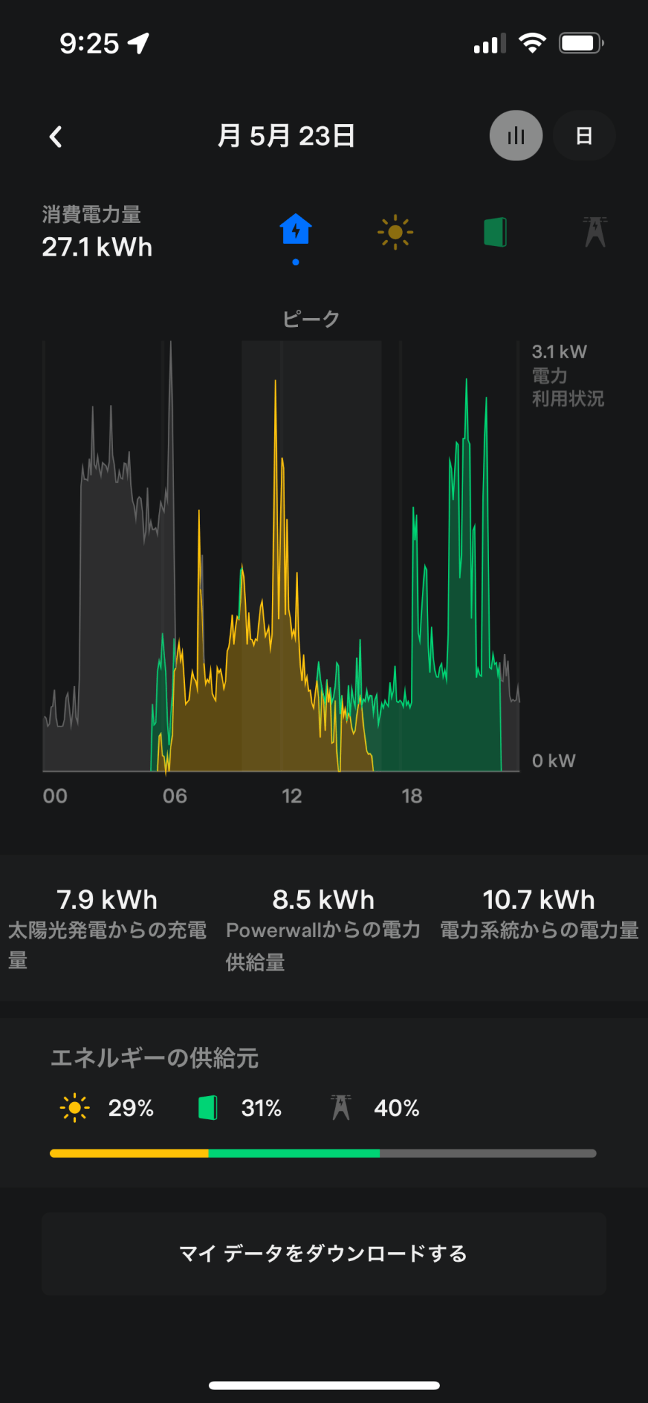 記念すべき初日。黄色が太陽光発電、緑がPowerwall2、グレーが電力会社からの供給分。約1週間かけてAIがこの家に最適な電力マネージメントを学習するらしい。18時の試運転以外はまだ特別な動きはなかった。