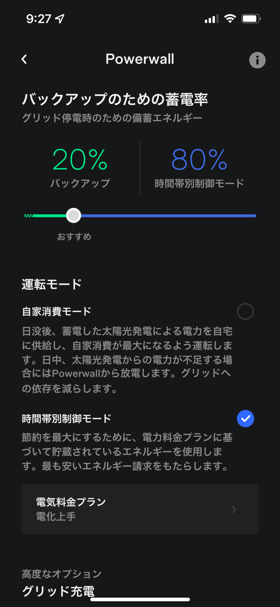 工事が終わるとTESLAからメールが来るのでそれに従ってアカウントを作成してTESLAアプリをインストールした。バックアップのための蓄電率は20%がおすすめらしいのでとりあえずそのまま。運転モードは自家消費モードと時間帯別制御モードがあって色々細かく設定が可能な時間帯別制御モードにした。よりスマートな感じだしね。