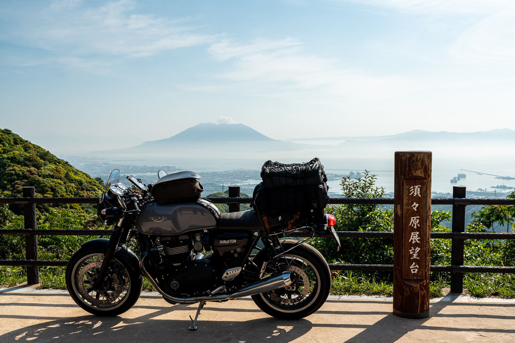 右側に錫山展望台を発見してすぐバイクを停めた。錫山展望台は駐車場の脇に高台を作って少し眺めをよくしたような施設でまだ登りきってない所にあって右側が山で遮られてちょっと無理矢理感のある展望台だった。それでも車で来た若いカップルが高台に登って桜島を背景に自撮りをしてたので展望台としてちゃんと機能してるのかもね。