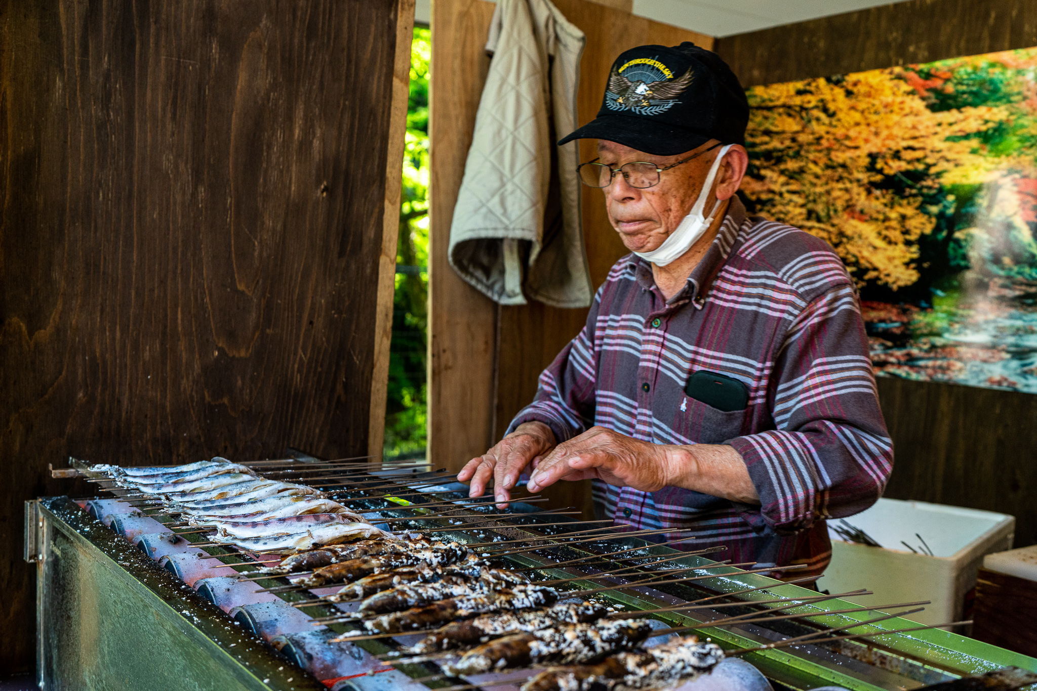 菊池渓谷ビジターセンターで年配のお兄様二方がヤマメを焼いていたけどすごくフレンドリーで話が面白かったのでRYOさんとヤマメの塩焼きをいただく。