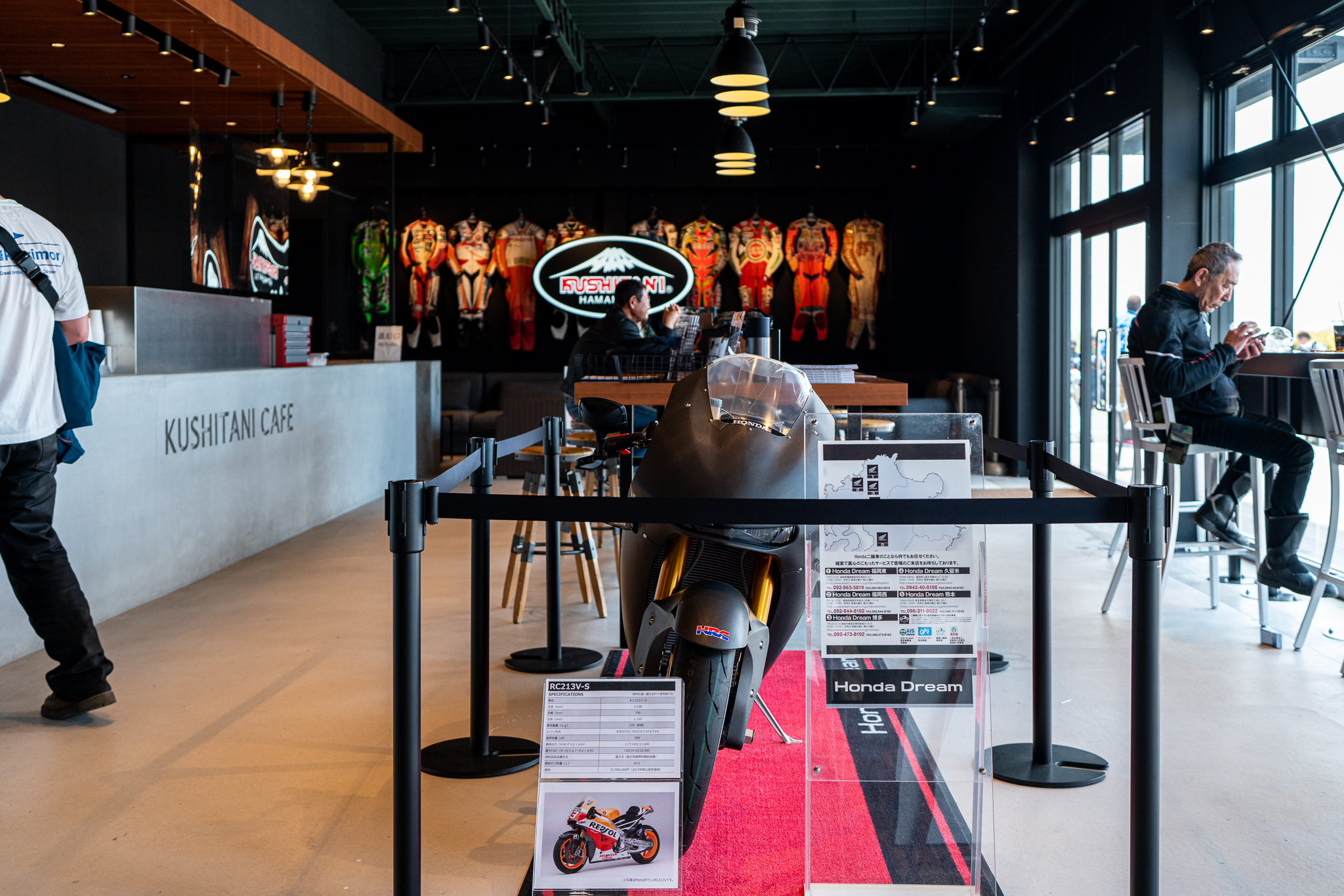 店内にはHONDAのRC213V-Sというバイクとレーシングスーツが展示されていかにもバイクカフェって感じ。