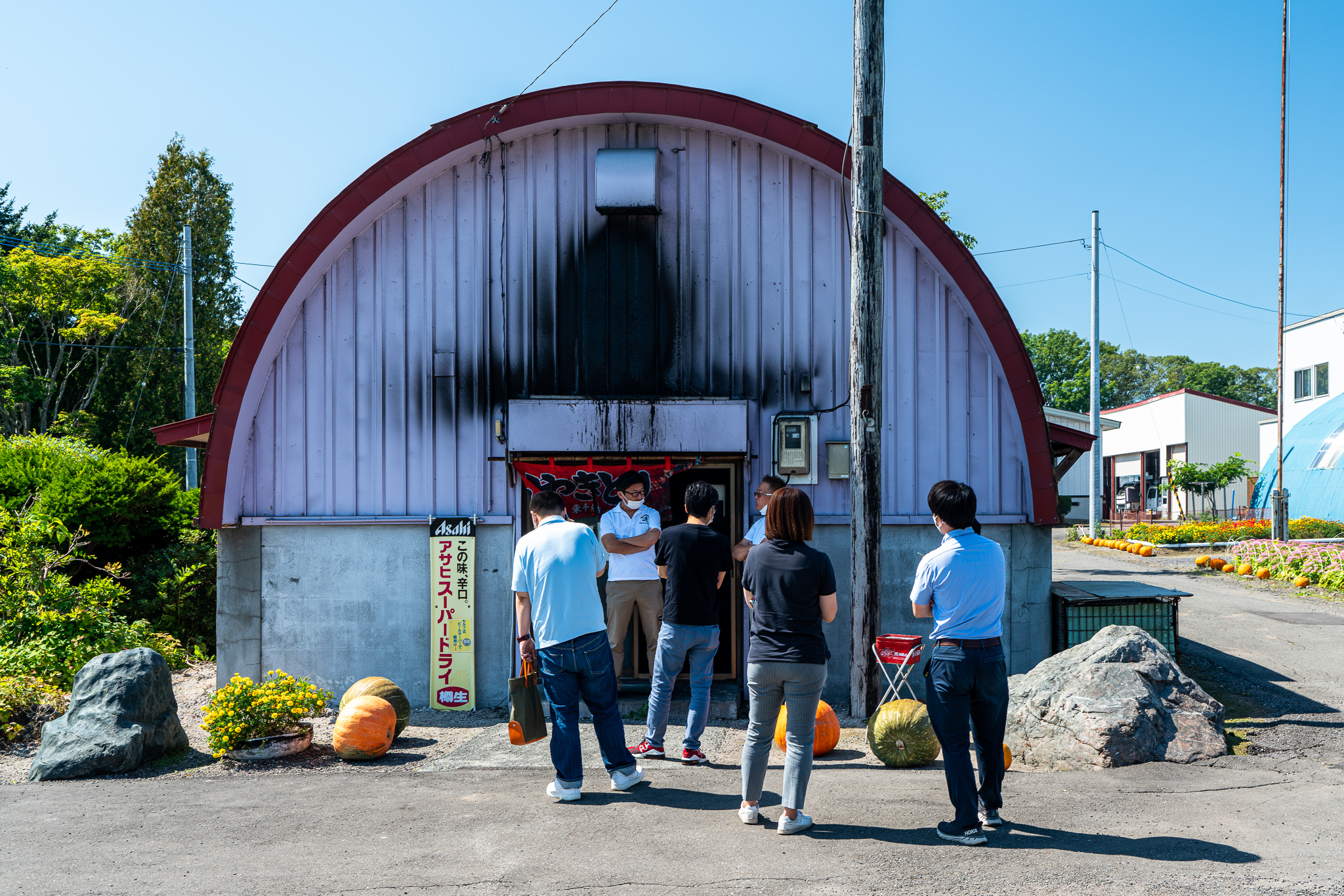 着いたのが11時半、昼前にも関わらずすでに行列ができていた。観光客よりは地元の方が多い感じだけど実はここの周りに何もないんだよね。周りは全部畑でポツンとこの店があるが、この店もまた北海道によくあるD型ハウスと呼ばれる農業用倉庫を改造したお店なのでそこに人が並んでるとなんか不思議な感じがする。