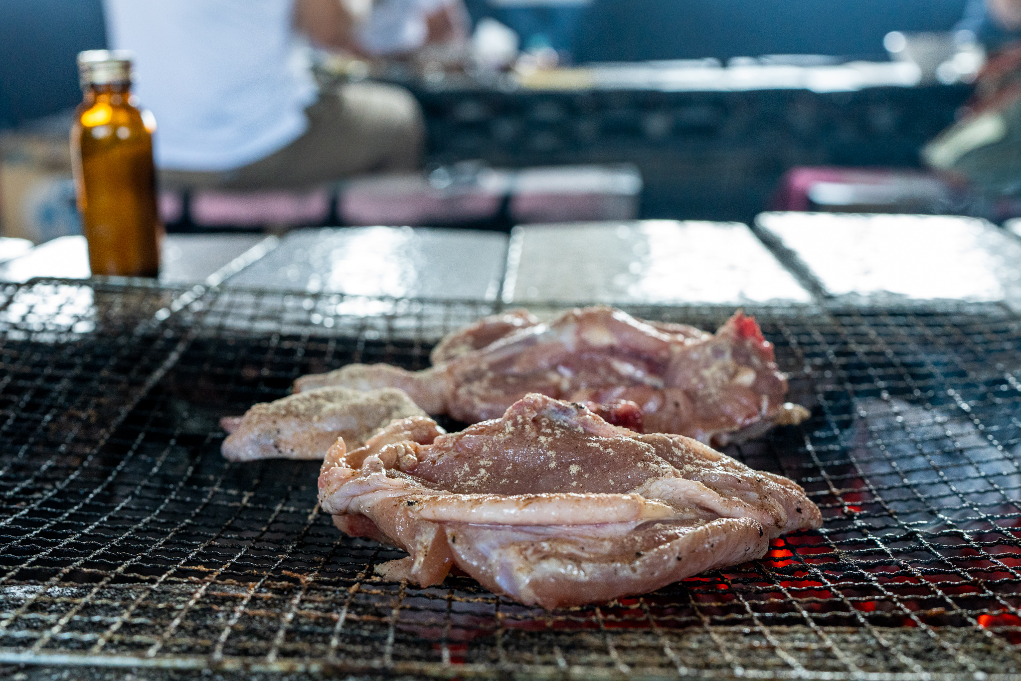 注文は極めてシンプルで、まずバーベキュー(鶏肉)を頼んで野菜炒めかご飯をオプションで頼む感じ。野菜炒めも美味しそうだが、一人なので全部食べ切る自身がなくてバーベキューとご飯をお願いした。店のお母さんがすぐ鶏肉を運んできて目の前で塩コショウを適当に振ってから網の上に。後は自分で適当に焼いて食べるスタイルだった。飲み物はセルフ。