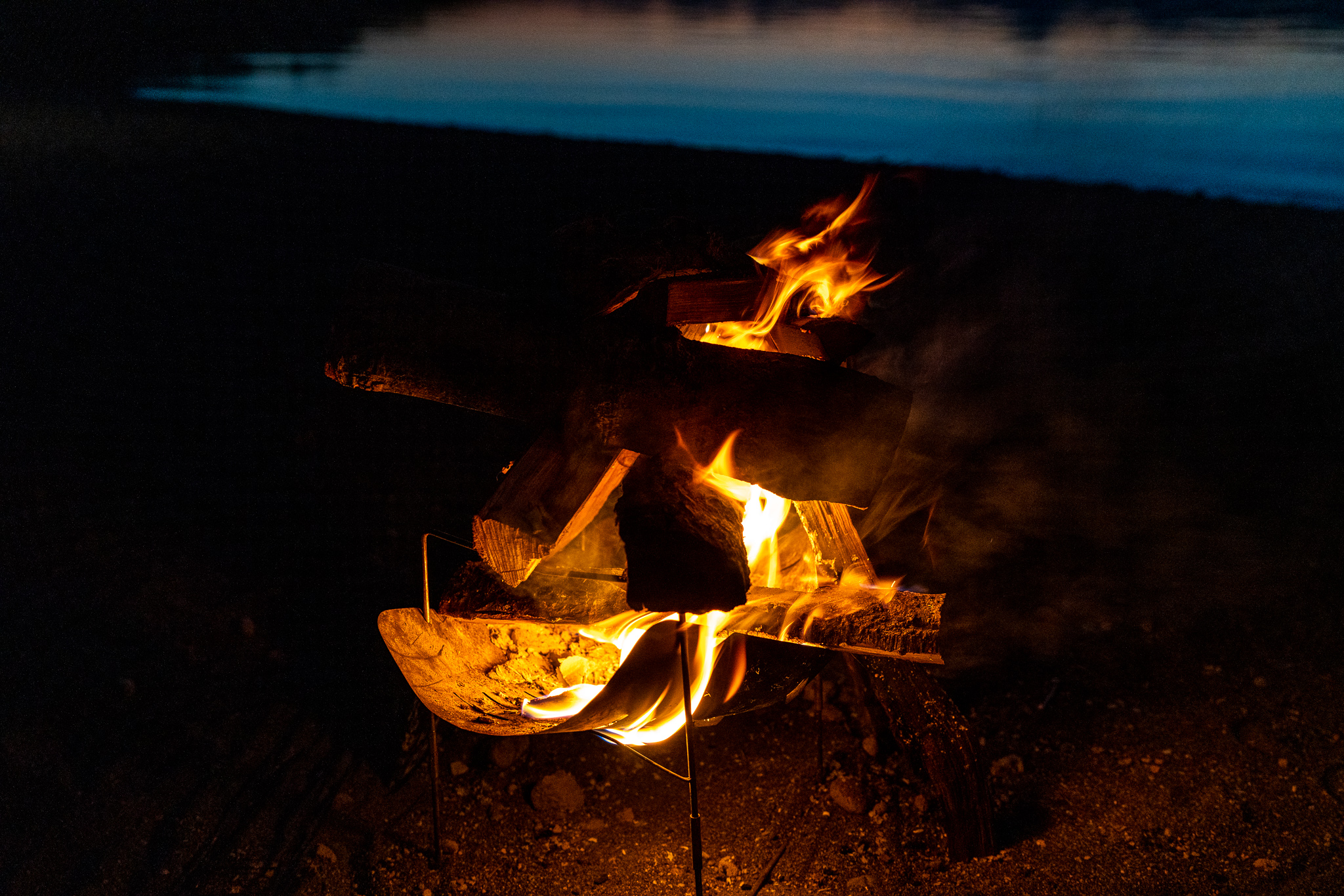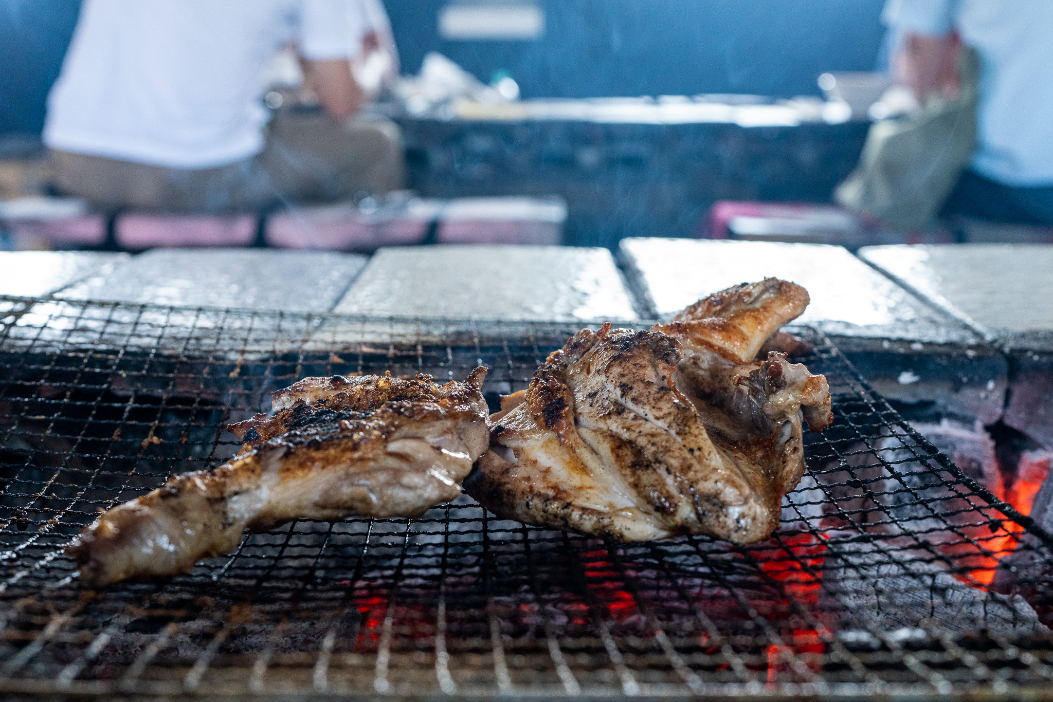 今まで磨いたアウトドアスキルで綺麗に焼き上げたけど炭火の火力が強くて焼き鳥と一緒に自分も焼かれる感じ。水風呂でもあったら入りたいくらいのサウナ感。その中で熱々の焼き立ての鶏肉を頬張るとすごく生きてる感じがする。これが「生きる」ということか!食べるためにはエネルギーが必要なんだね。食事というよりは格闘に近い。味付けは塩コショウだけだが、炭火の香りと鶏肉そのものの生命力みたいなのが交わって美味しい。