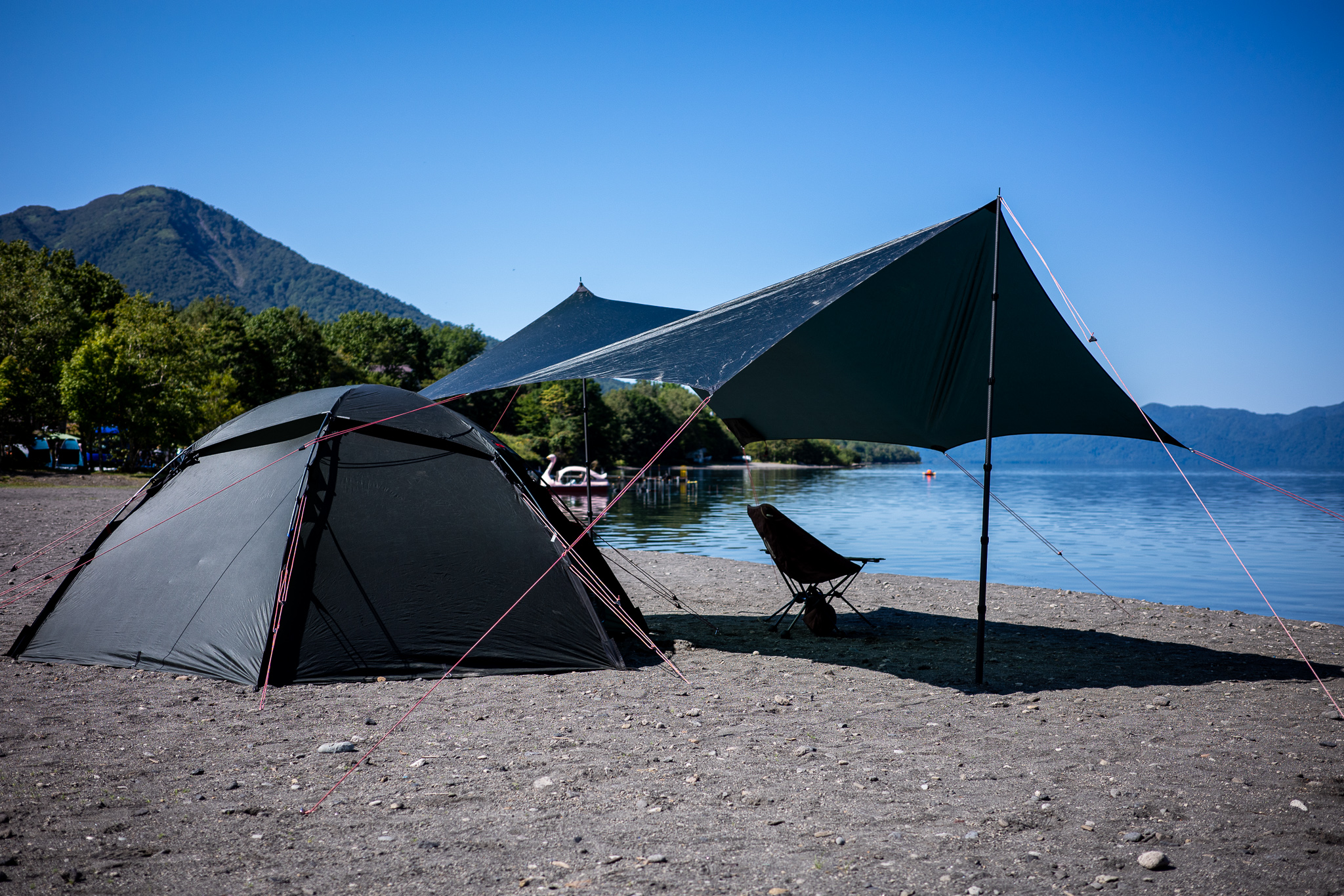 多分一番早くチェックインしたのでど真ん中で湖と近くて絶景を楽しめる所にテントとタープを張る。砂場で木がないので日陰がなくてタープは必須。