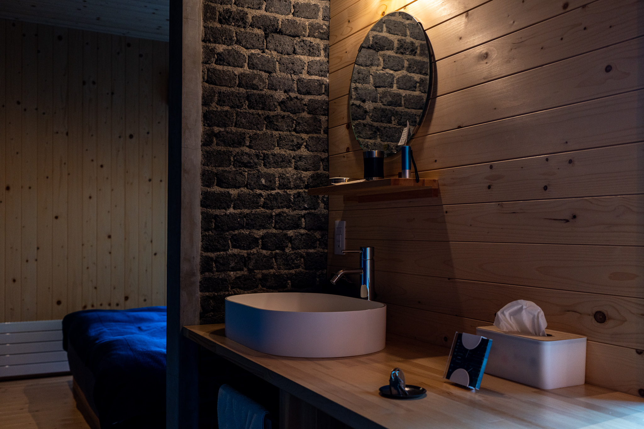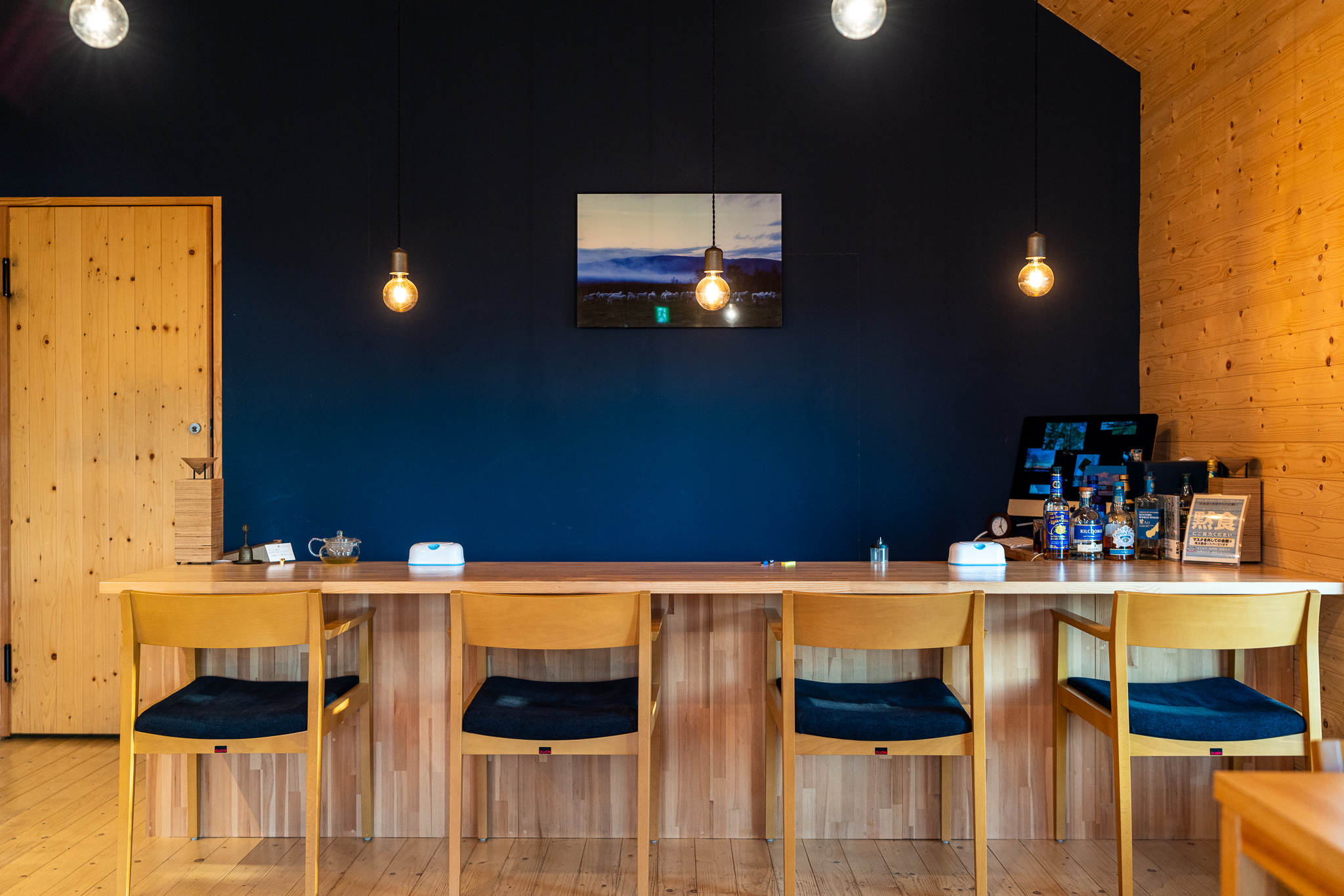 中に入ると真正面に青い壁とカウンターがまず目に入る。「青」がこの宿のメインカラーなのがよく分かる。木と濃い青が落ち着きをもたらしてくれる。
