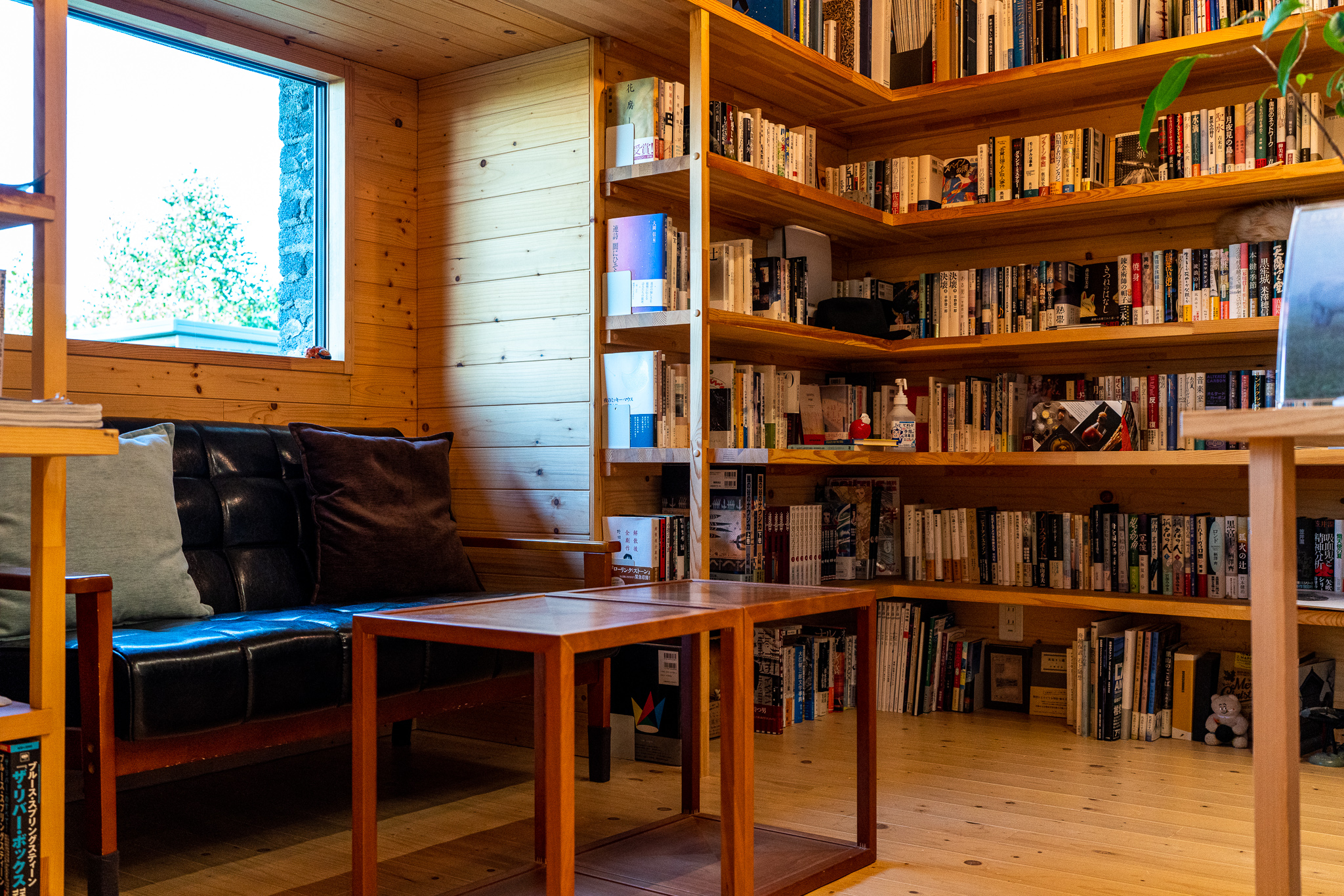 左側には書斎があって本棚に本がずらりと並んでいて一面は全部村上春樹とその関連書籍で埋まっている。自由に本を取ってあのソファで読んでもいいし、部屋に持ち込んで読んでもいい。この宿にはあえてテレビが設置されてなくて本を読むのに最適されている。