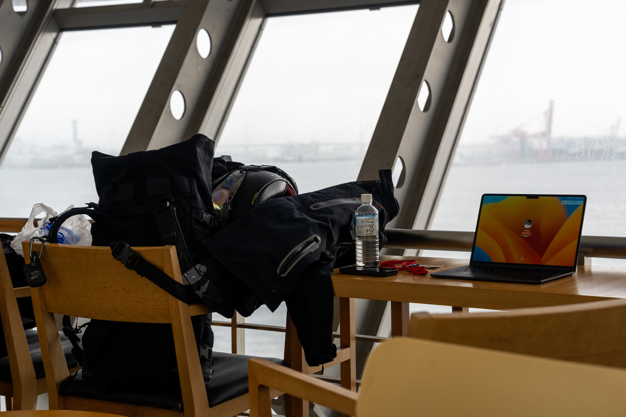 チャンスとばかりに荷物を広げ、溜まったタスクを片付ける。まだもう少しコンパクトにまとめる練習が必要だ。リラックスしすぎたのか、連絡に来たパンスターフェリーのスタッフを少し驚かせてしまった。反省。