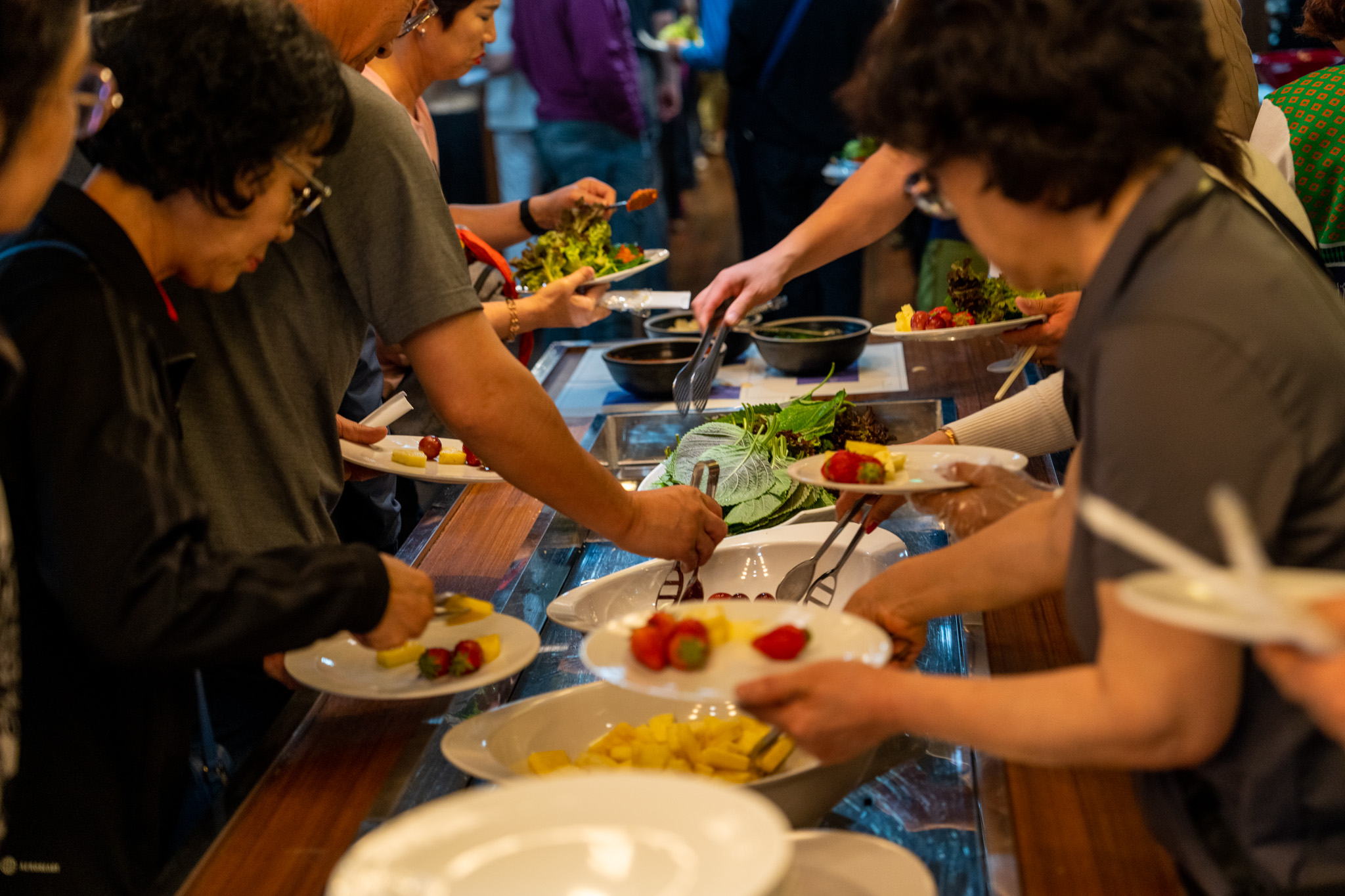 慌てて列に加わる。ビュッフェ形式だが、皆さんの勢いがすごい。料理はすぐに空になり、スタッフがせっせと補充する。このエネルギッシュな光景に、なぜだか少し胸が熱くなる。