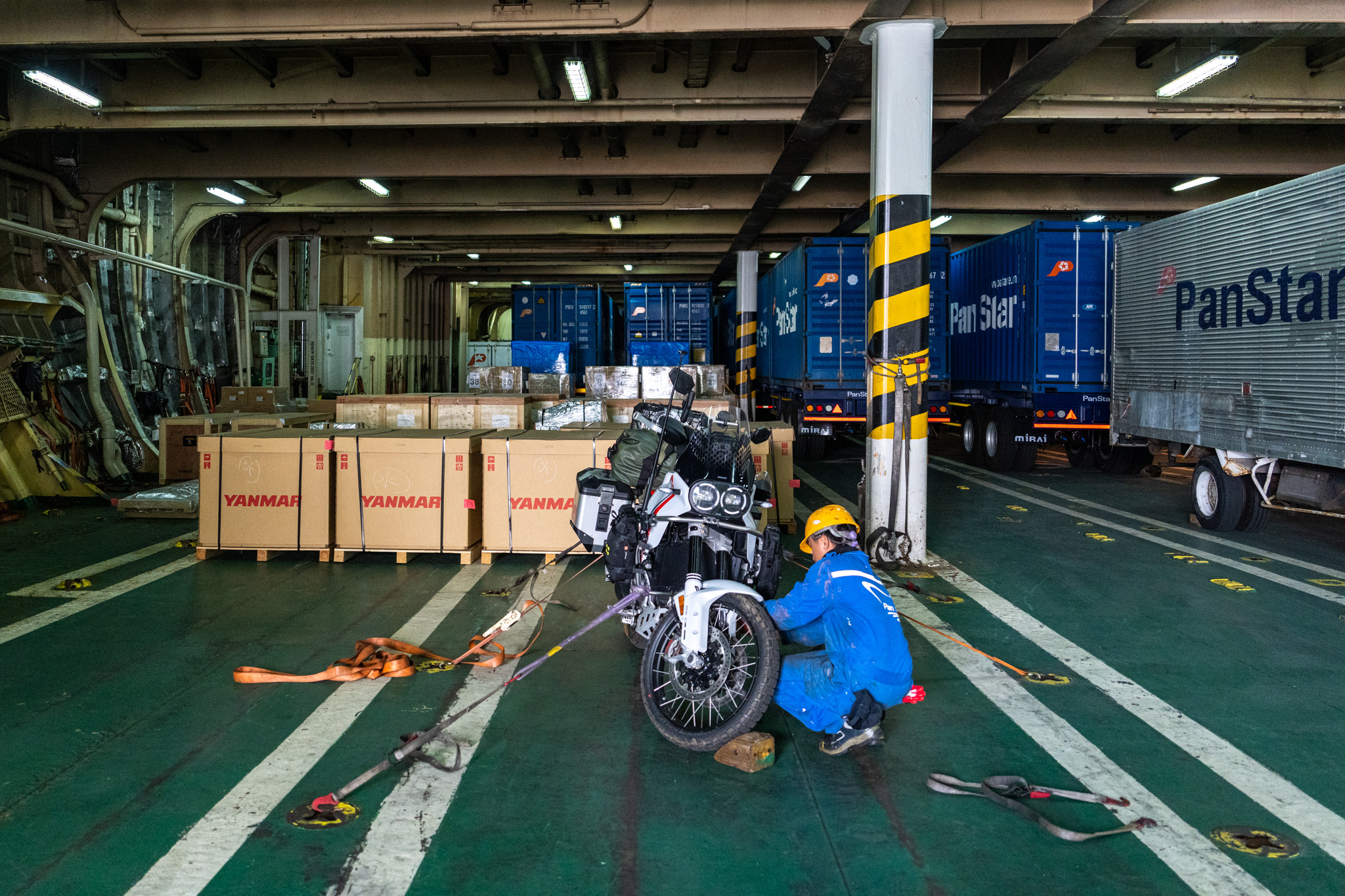荷物をまとめてロビーへ向かうと、すでに長蛇の列。皆さん行動が早い。下船もバイクは別動で、スタッフが車両甲板まで案内してくれた。
