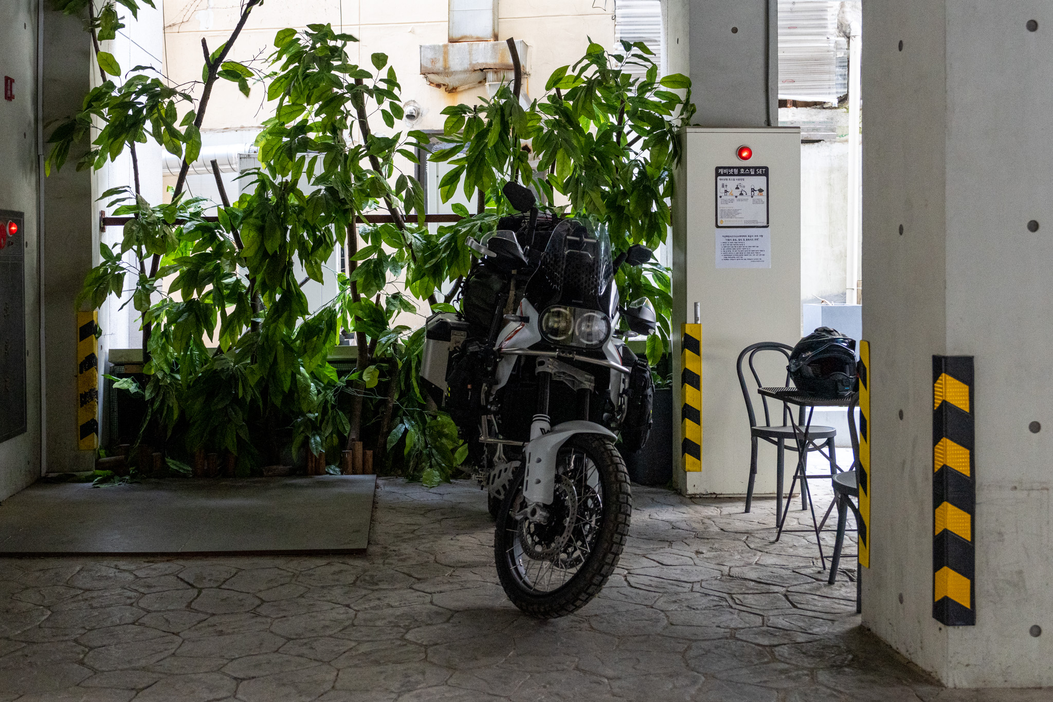 バイクを停めようとすると、支配人が出てきて屋根付きスペースに案内してくれた。ありがたい。