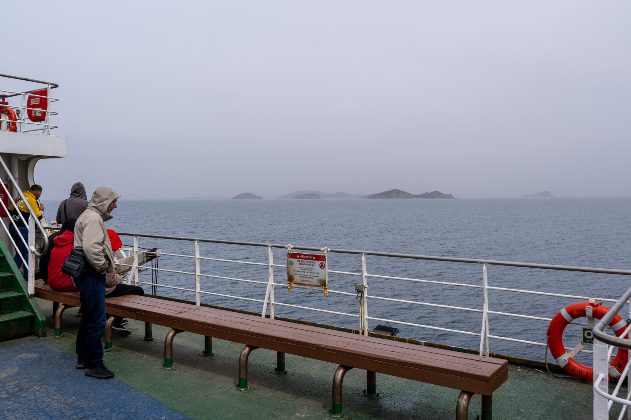 岸が近づくにつれて乗客もそわそわし、デッキには人があふれる。そして皆さん本当によくタバコを吸う。元喫煙者として気持ちは分かるが、それでも驚くほどの本数だ。