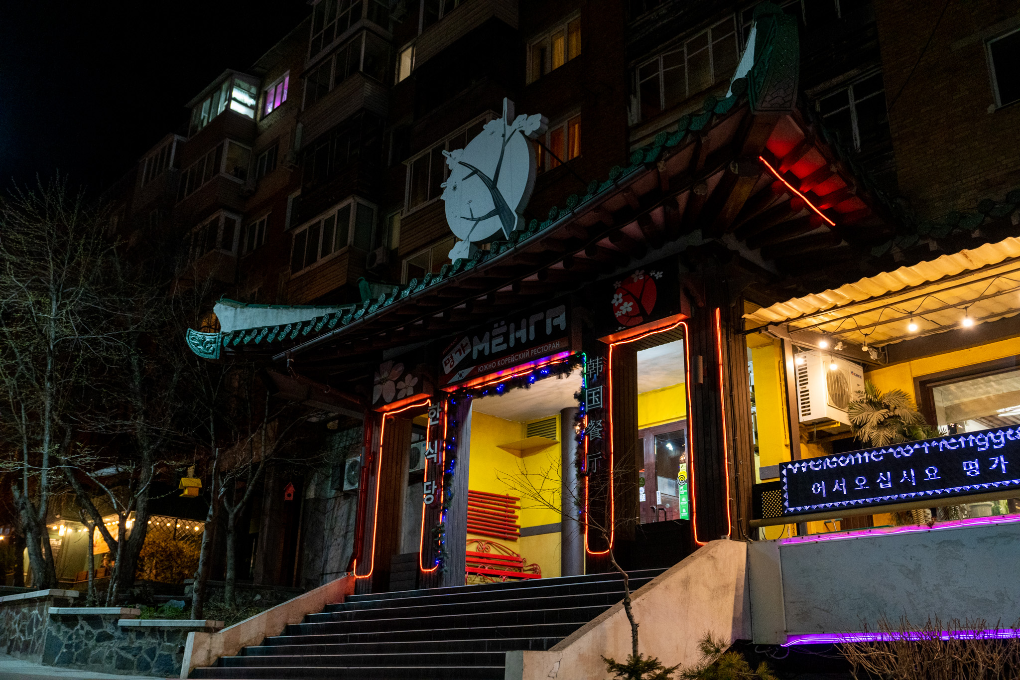 シャワーを浴びて夕食をどうするか考えていると、隣のホテルの朴さんから「遅くまでやっている韓国料理屋がある」と連絡。22時を回っている時間帯で開いている店は少ないが、行ってみることに。