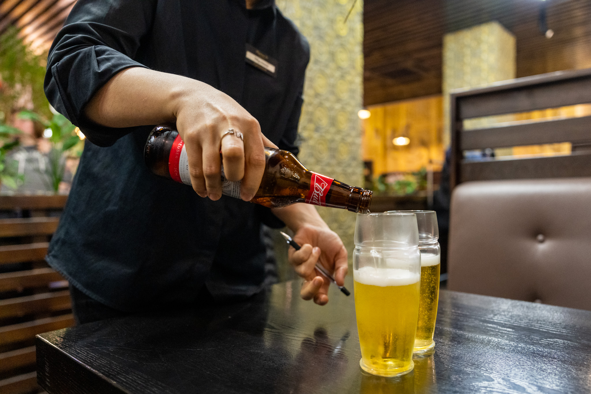 まずはビール――まさかのアメリカ・バドワイザー。長い一日の後の一杯は格別だ。お疲れさま。