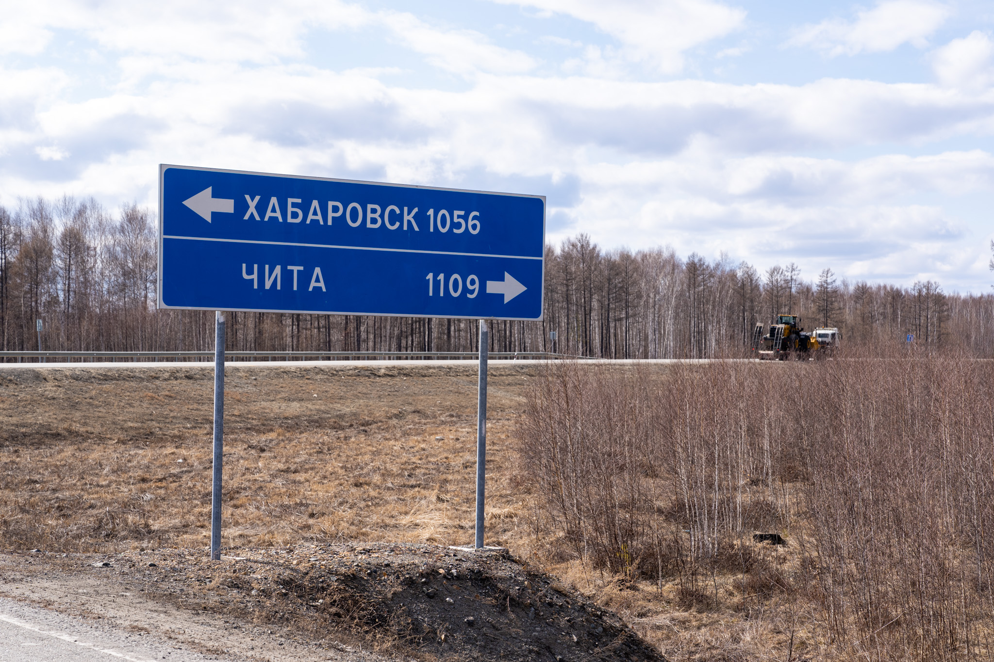 食後はまた自分たちのペースで西に向かう。またちょうどいい所にパーキングエリアがあったので一休み。ハバロフスクから1056km、チタまで1109kmの所、ちょうど真ん中辺りまで来た。道路表示版にずっとチタまで何キロと書いてあるのでチタに導かれている気がしてなんだか約束の地に思われてくる。