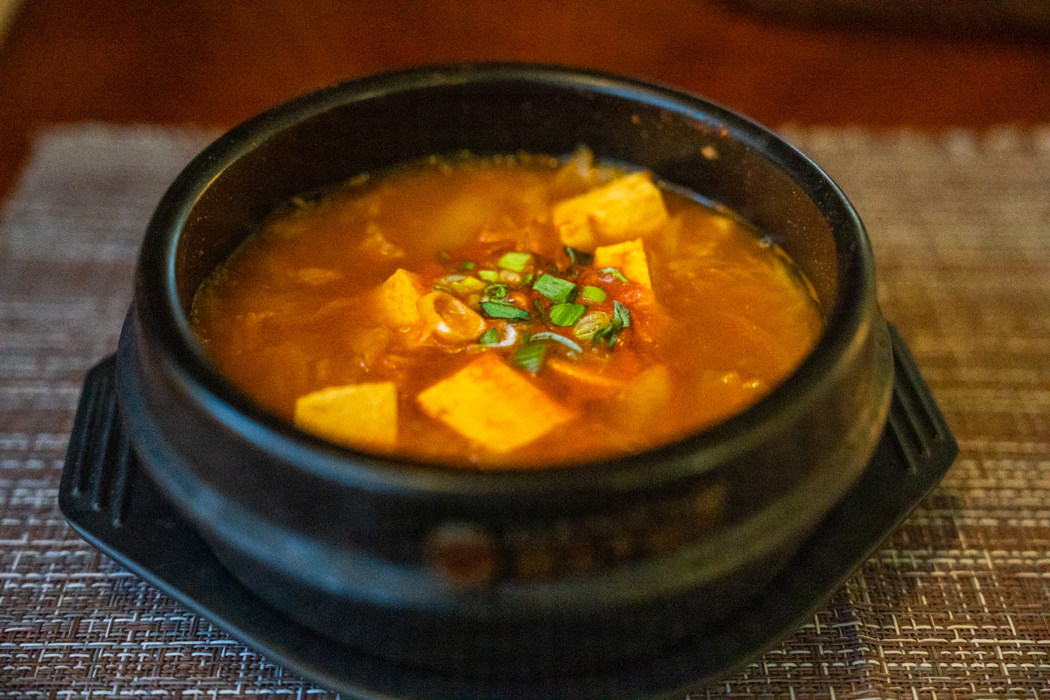 あまり失敗したくないので定番のキムチチゲを頼んだ。ビジュアルはそれっぽいのだが、実は肝心のキムチが入ってない!キムチが入ってないキムチチゲを食べたのは初めてだが、悔しくもお味は完全キムチチゲ。そんなことがあるのか…。