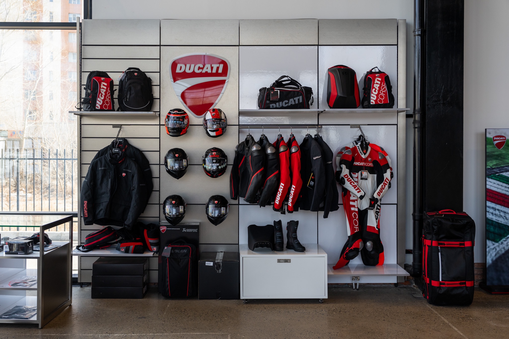 一階は展示スペースだが、昨日のオープニングセレモニーのためバイクは全てピットのほうに移動してあるらしい。ライディングウェアやアクセサリーなどは一階と二階に分けて置いてあった。Ducati Redがポイントカラーに入っているウェアもいいかもしれない。