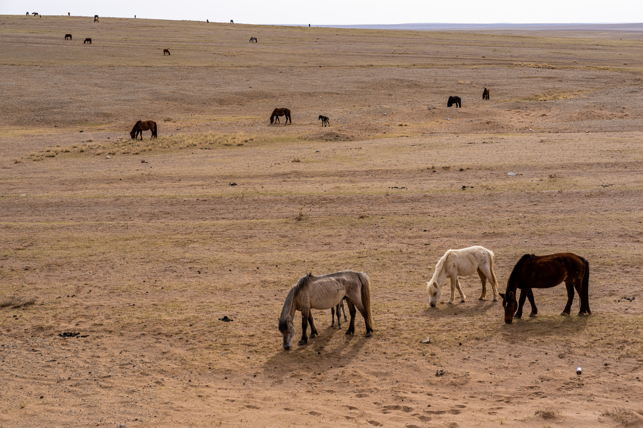 またたくさんの馬たちが僅かに生えている草を一生懸命食べていた。放牧できる土地が決まっているのかな?遊牧民は自由に草がある所に行けないのか?