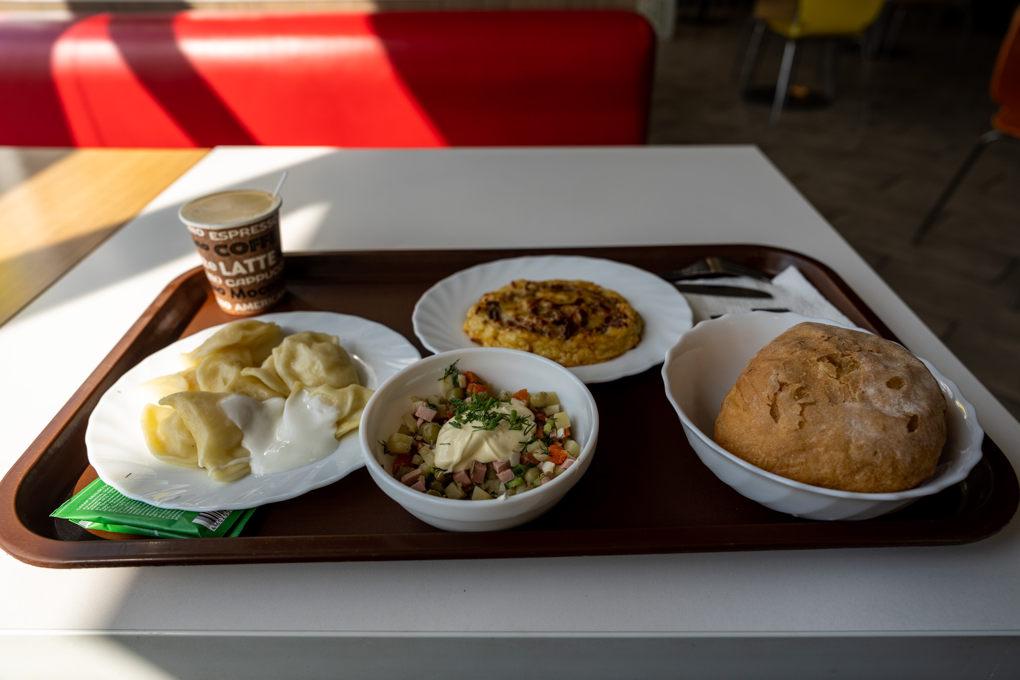 サンプルを見て色々頼んだら注文を受け取ってくれたおばあちゃんがパンは注文しないのかと聞いてきたのでついでにパンも注文した。ロシアではパンが主食でパンを頼まないとおか「ずだけ頼んでなんでご飯を食べない?」に近い感覚なのかもしれない。おばあちゃんもしっかり黄色いユニフォームを着ていた。