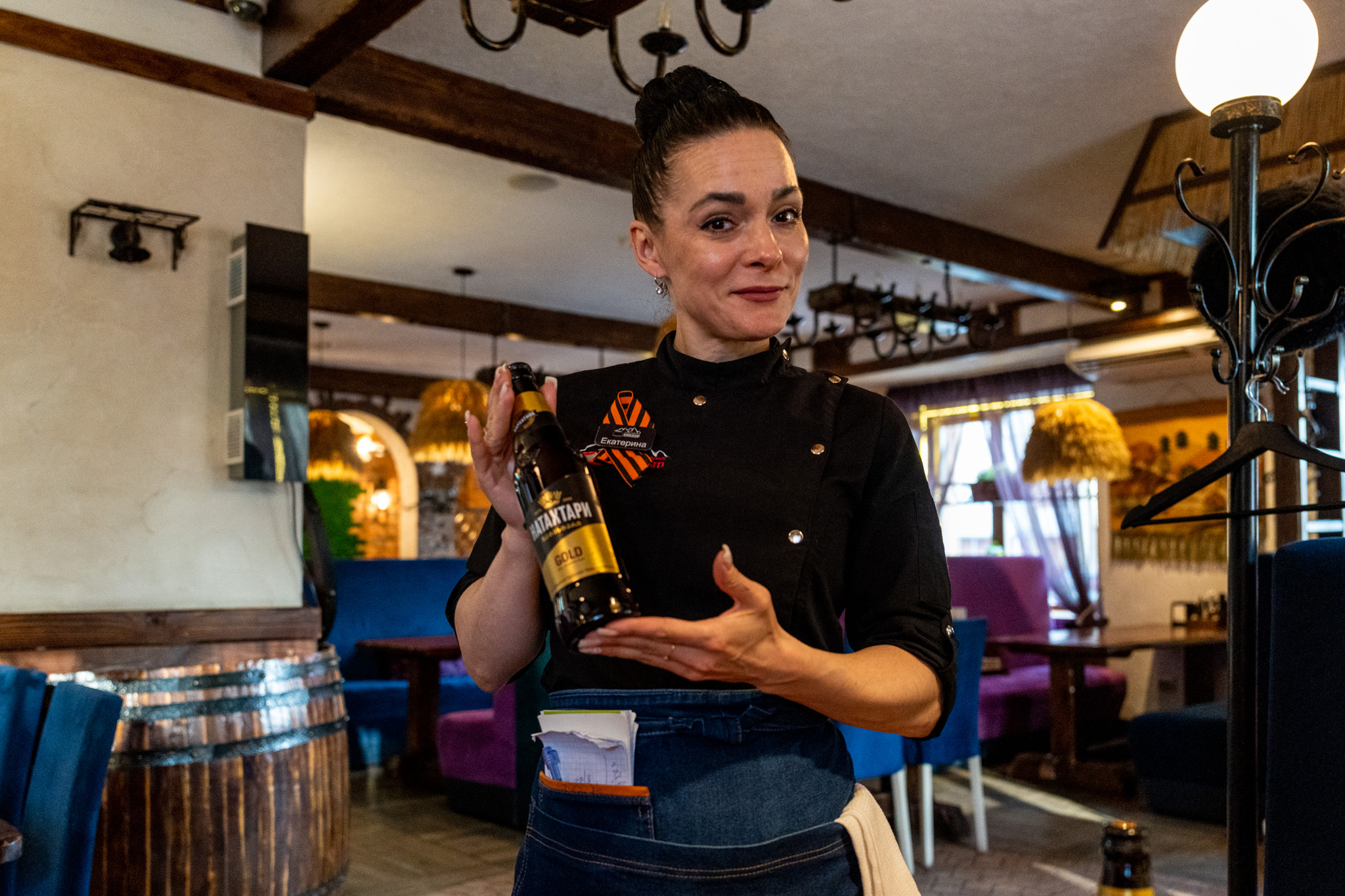 注文とサービングを担当してくれたエカテリーナさん。彼女は接客のプロでミシュラン三ツ星レストラン並みの接客だった。ホスピタリティも溢れていて彼女のおあかげでより楽しく食事ができた。彼女が持っているのはジョージアのビールでこれも深みがあってなかなか美味しかった。