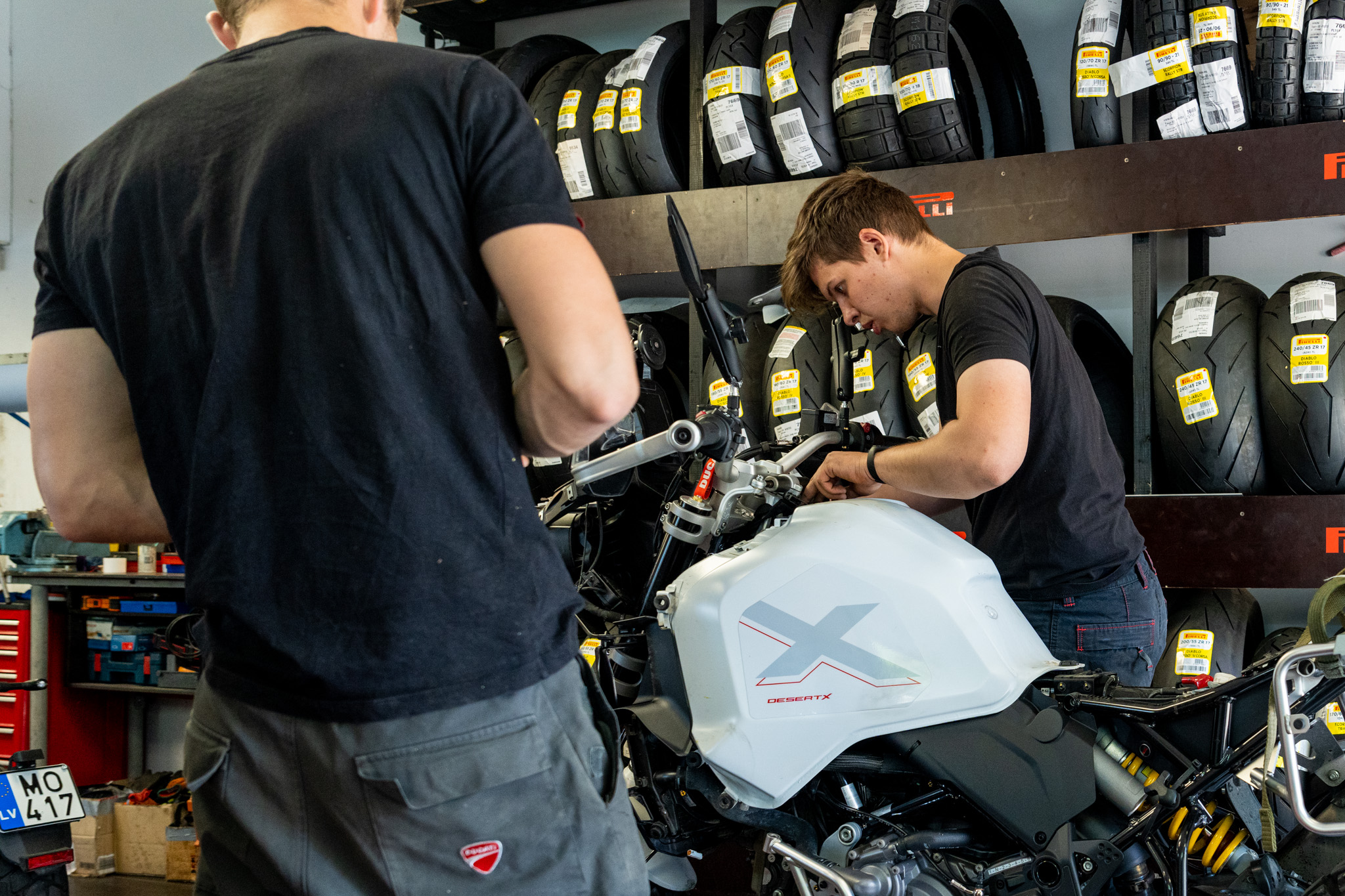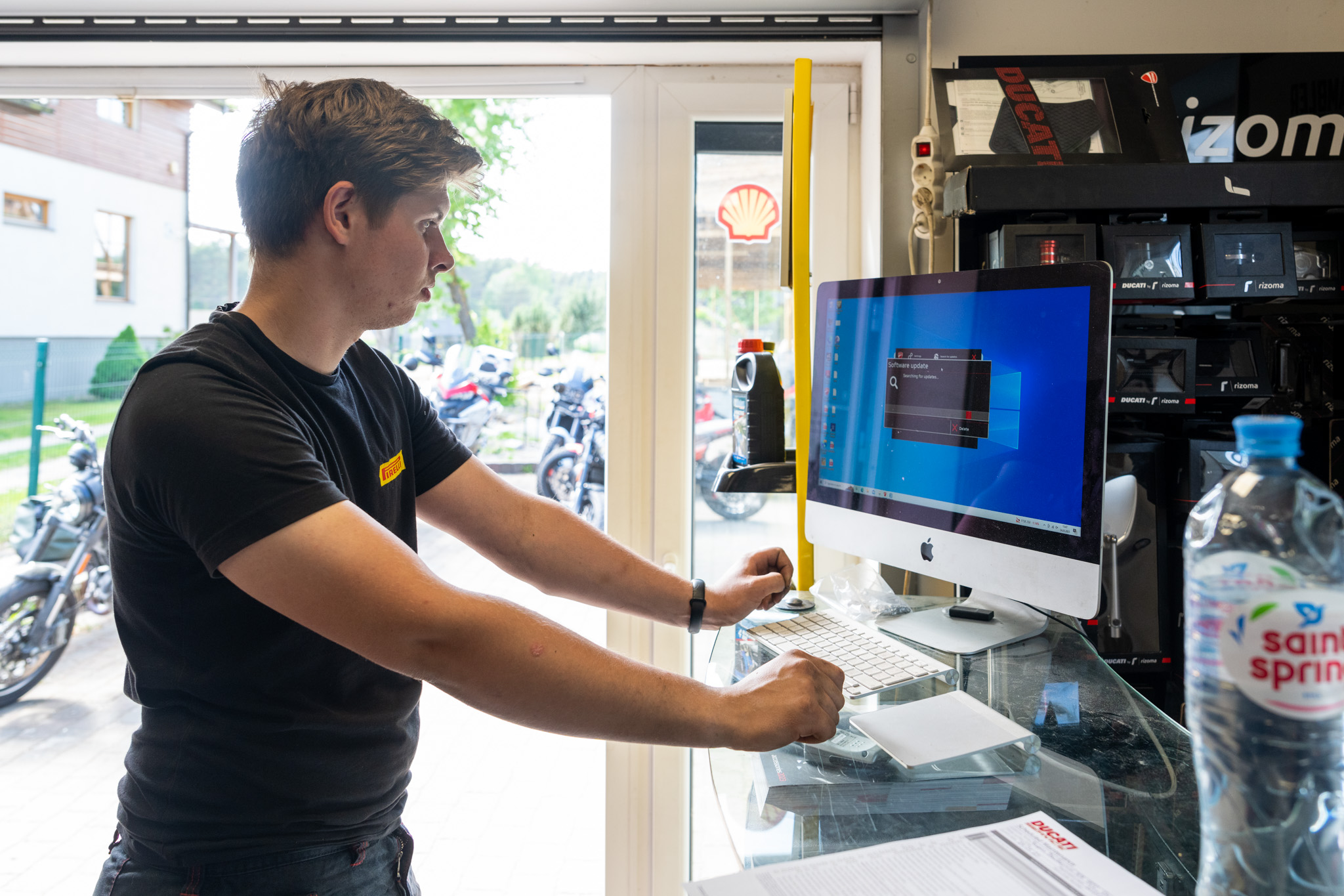 案内してくれたHarijsさん。ハリンスと読むのかな。彼がサービスマネージャーでどこをどう点検するのか何が必要なのか色々と相談に乗ってくれた。納車されて1,000kmの初回点検をDucati東名横浜で受けてこの旅に出たので3,000kmことにエンジンオイルとオイルフィルターを交換する以外ちゃんとした点検を受けてないので色々見てもらうことにした。Harijsさんと話をしていたら社長が来て敷地を案内したいと言われたので付いて行ってみた。