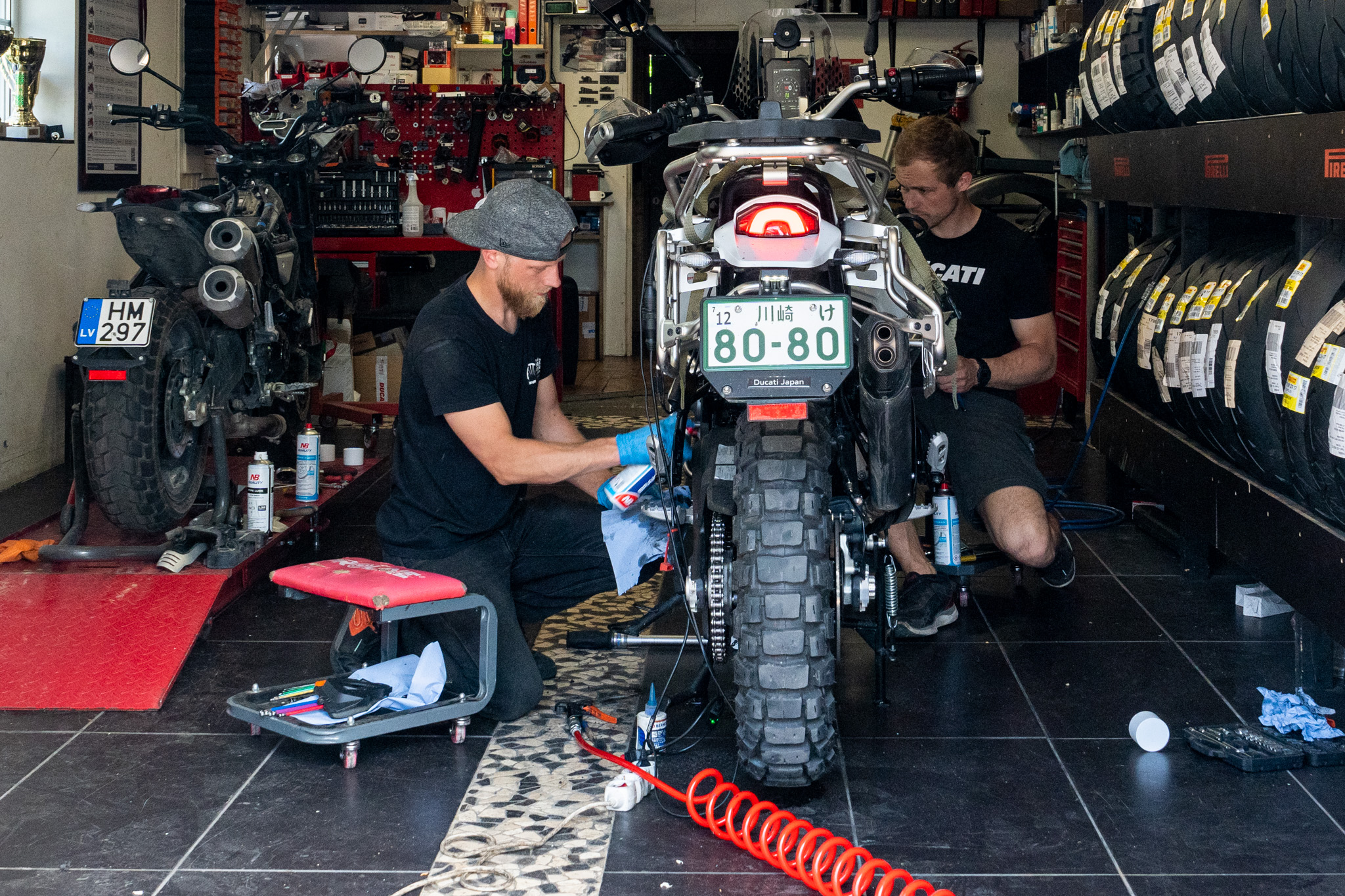 チェーンを綺麗にしてくれているGatisさん。彼はヨシムラとスズキが好きでいつか日本に行くのが夢だと照れながら言っていた。私が来た道を反対側から自分のバイクで行ってみたいと。その夢はきっと叶う!