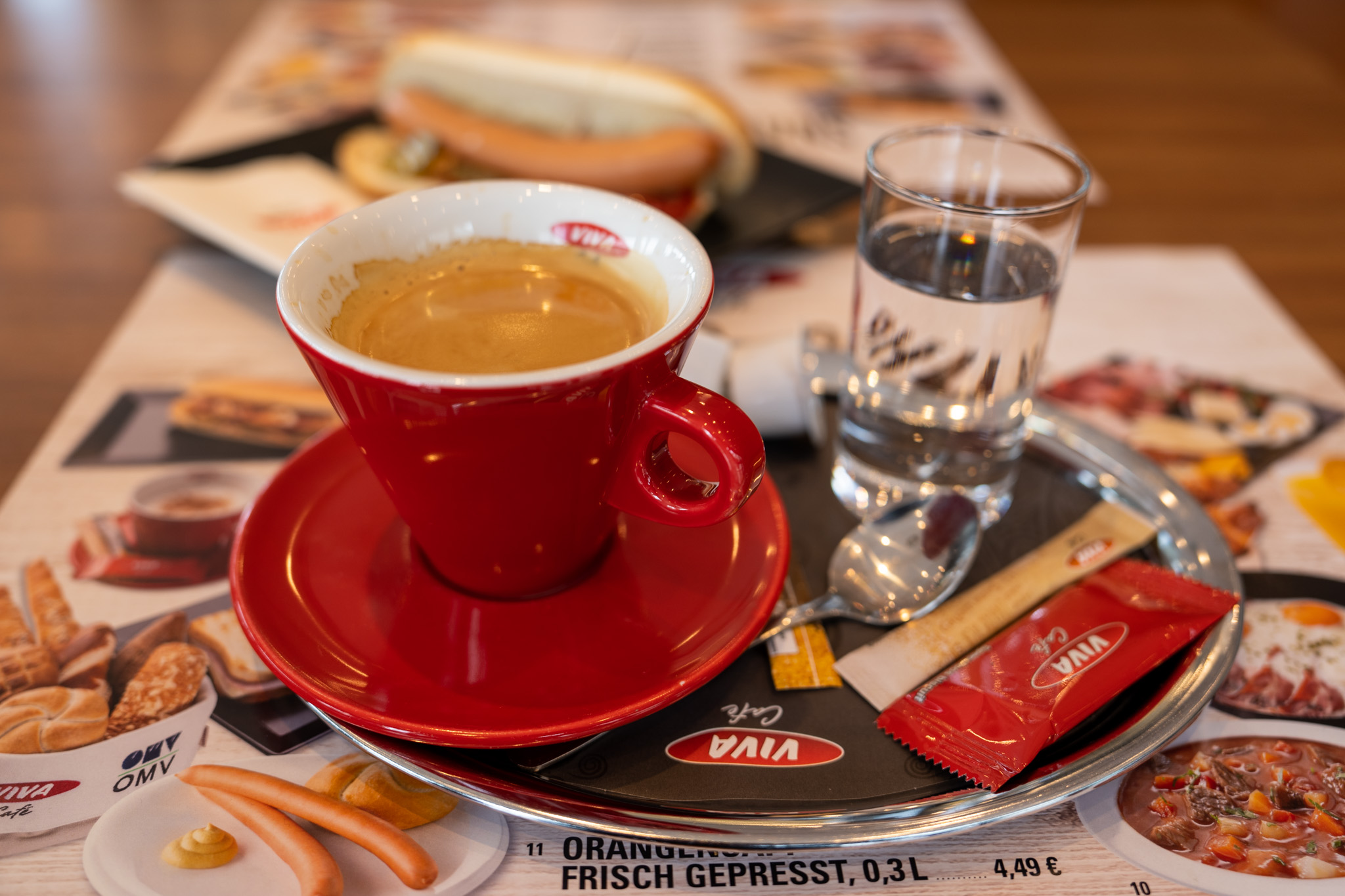出発して1時間くらい高速を走ってからガソリン・スタンドに寄って給油とブランチを。濃いオーストリアコーヒーが体に染みる。この一杯で元気が出た。オーストリアではワインを頼んでもコーヒーを頼んでも水を一緒に出してくれるので助かる。やっぱり味が濃いからかな。
