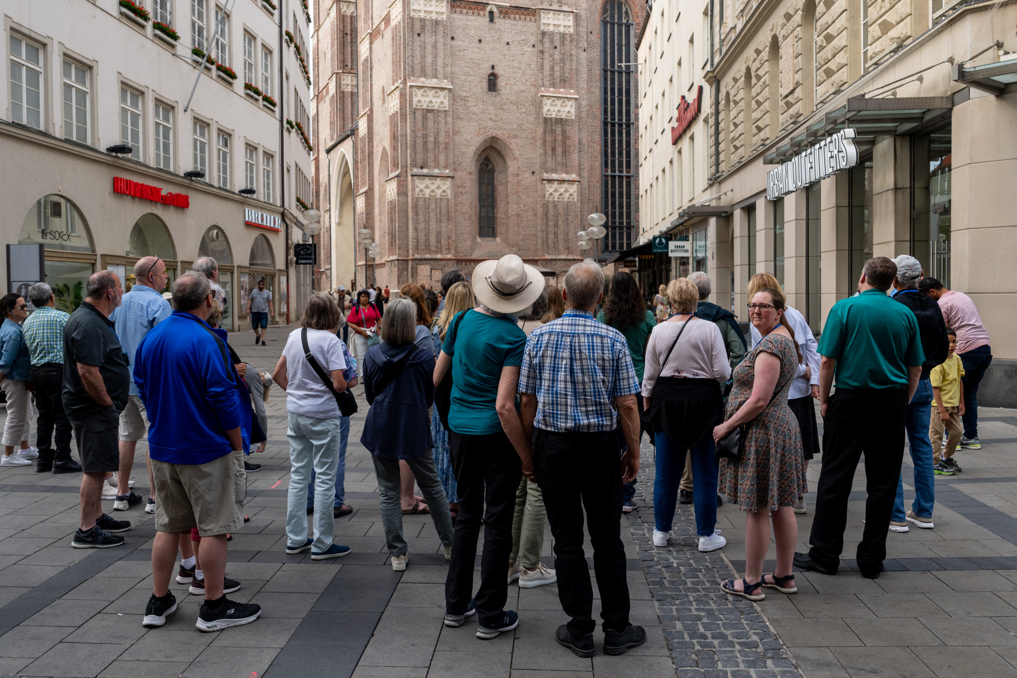 聖母教会の前で説明を聞いている団体の観光客。アメリカからの方々なのかな?説明を聞かず後ろを向いている女性は