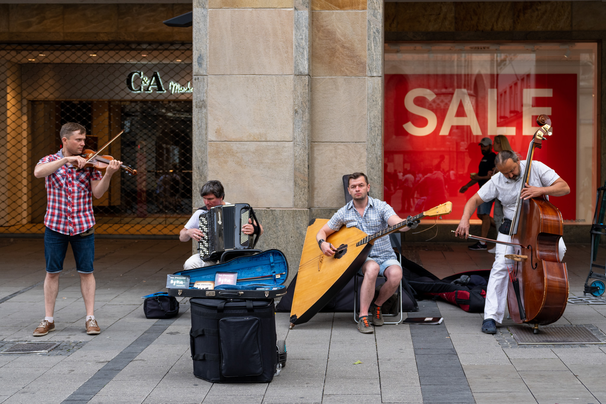 その真後ろで演奏している楽団が気になっている模様。この楽団は今までの旧市街で演奏していたミュージシャンの中では一番上手かったような気がする。演奏しながら自分たちのCDも売っていた。