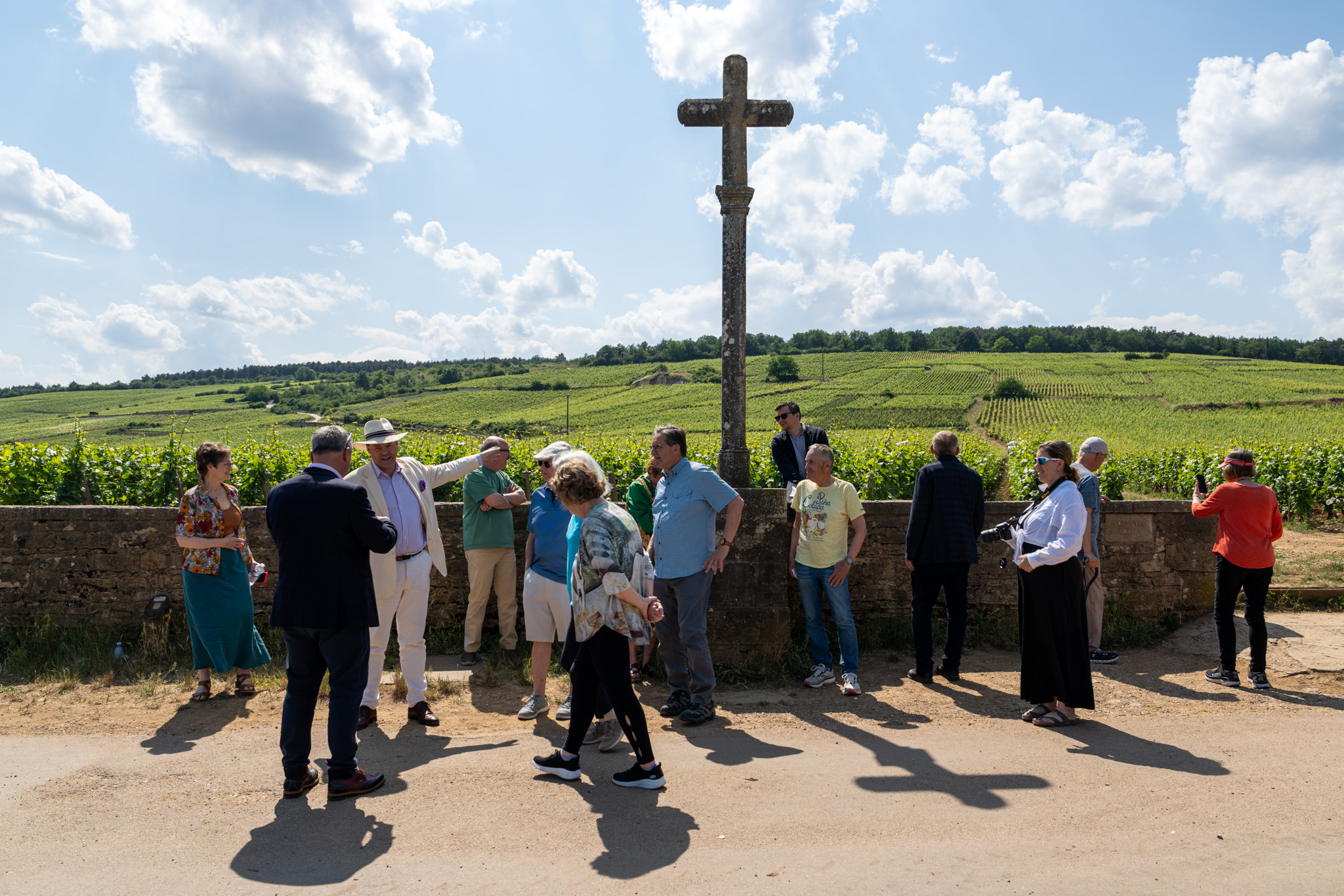 ロマネ・コンティのぶどう畑のシンボル、十字架のモニュメントまで行ったらアメリカからの団体観光客で賑わっていた。あの白いスーツにパナマハットの昔の映画から出てきたかのような方がツアーガイドでその設定も説明も素晴らしかったが、みんな聞いたり聞かなかったり写真を撮ったり。
