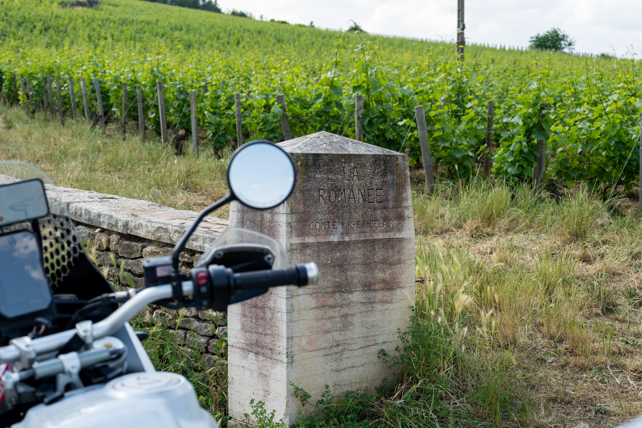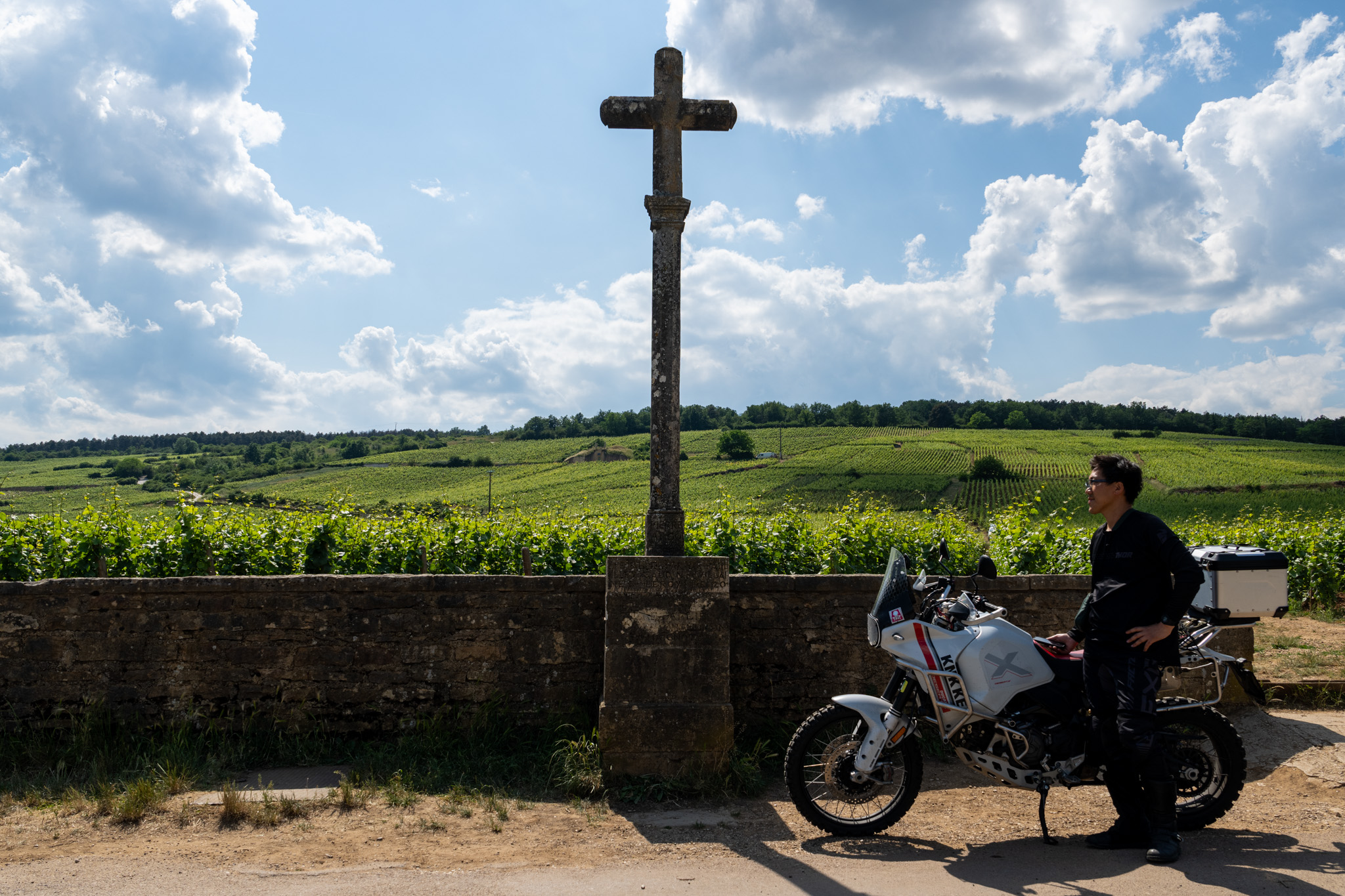 また斜面をバイクで登っていくと左側にラ・グランド・リュとラ・ターシュ、オー・マルコンソールの畑が広がっている。ぐるっと回ってクロ・パラントゥの所まで行ったらもう道はオフロードで結構荒れていたが、そこで密かにピクニックをしている人たちがいて驚かせしてしまった。こんな所にバイクでくるとは!DesertXを見てそのバイクは大丈夫とサムズアップしてくれた。こういうピクニックもいいね!特級のぶどう畑を見ながら仲間たちとワインを飲む!