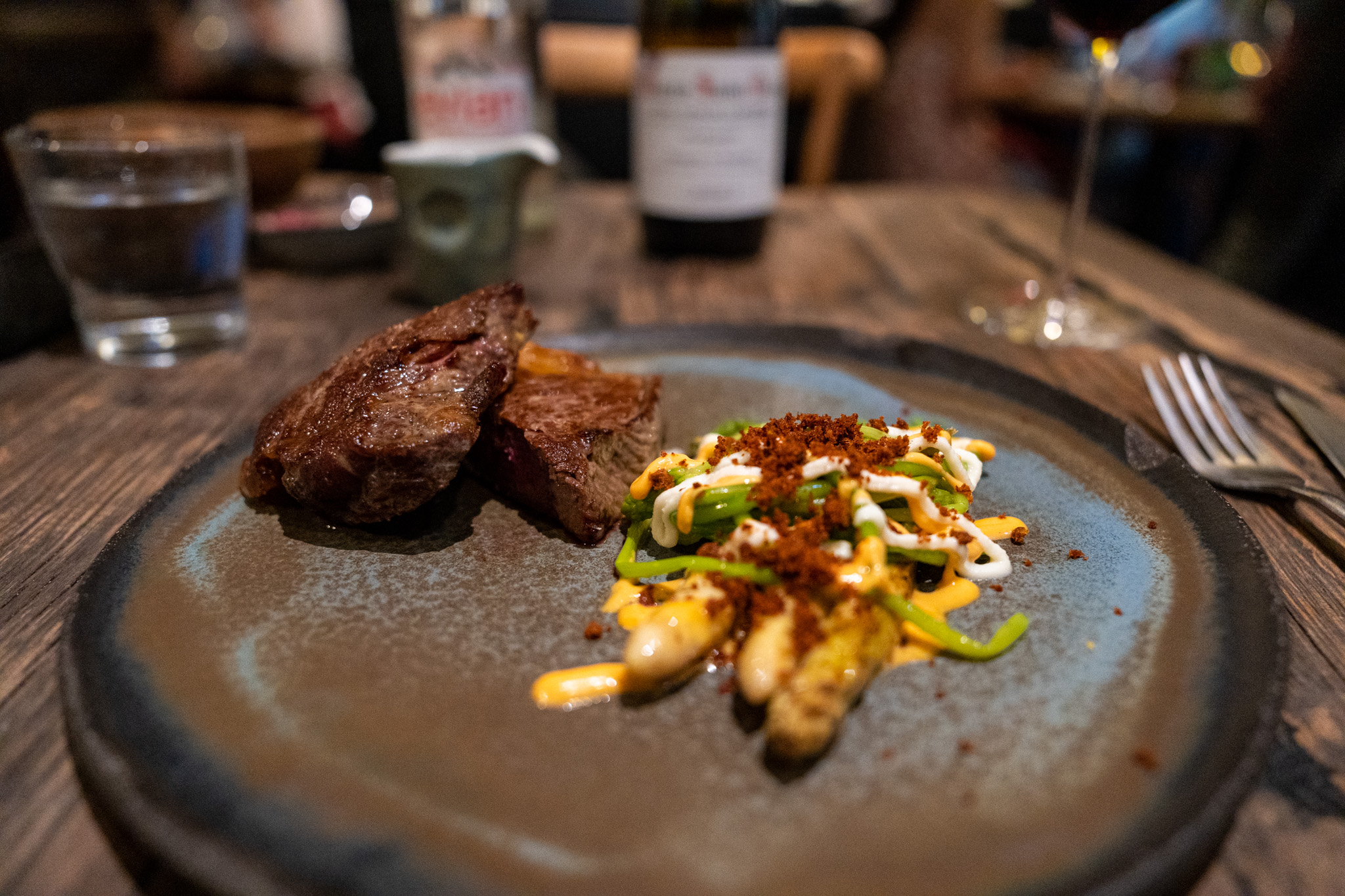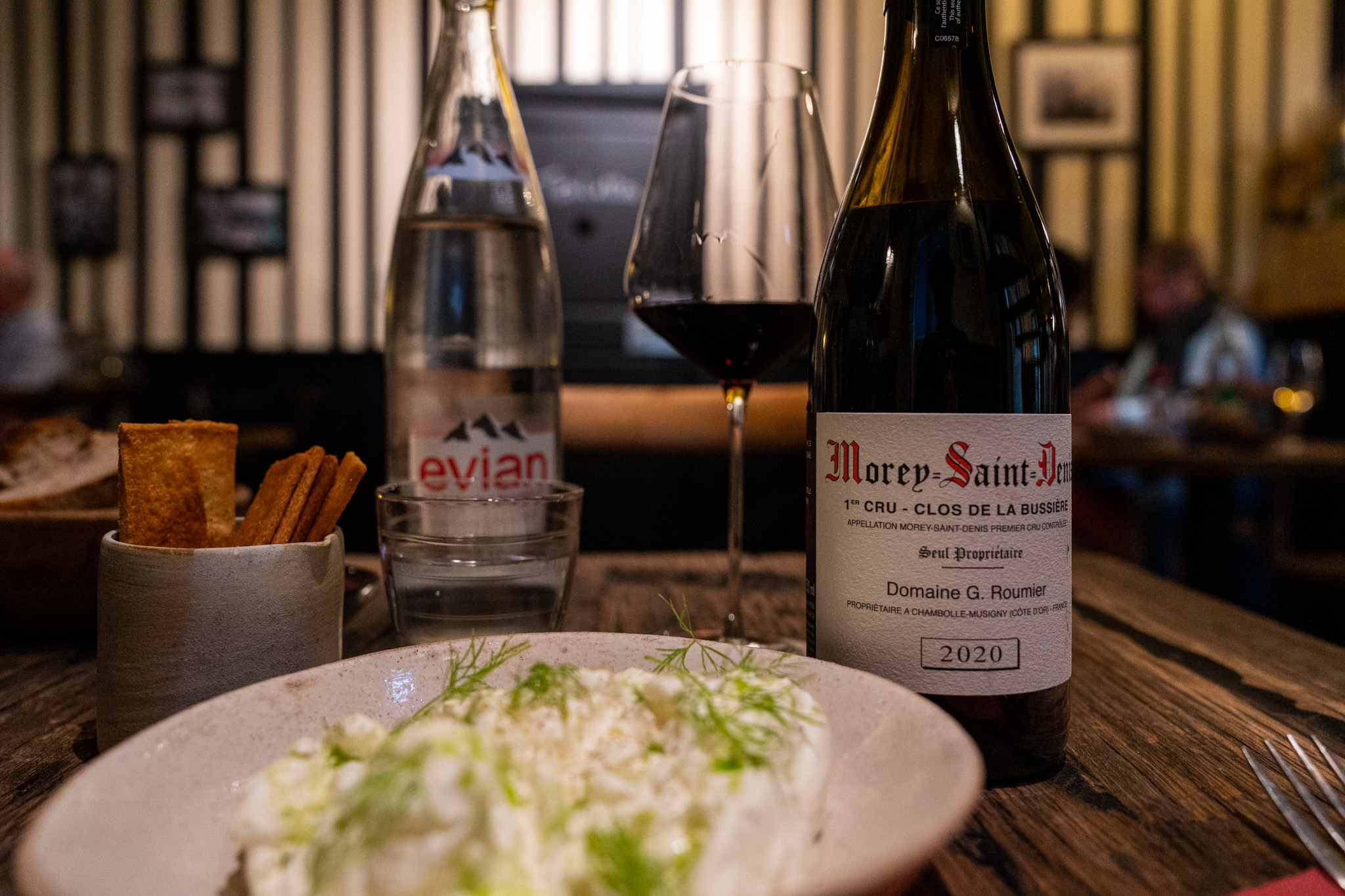 落ち着くのを5分くらい待っていたらやっと席に案内してくれた。料理のメニューは一枚だけだったが、ワインリストは一冊の本。またそのワインリストが充実していて東京の高級店のリストのような感じだった。その中からルーミエのモレサンドニ2020を選んだ。ルーミエの2019、2020ヴィンテージはプレミアムが付いてモレサンドニさえなかなか手に入らないのにここでは気軽なお値段で飲める!